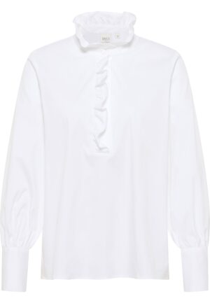 Komplettiert Ihr Outfit und darf in keiner Garderobe fehlen: Unser bügelleichtes, unifarbenes SIGNATURE SHIRT, aus unserer Premiumlinie 1863 by ETERNA, ist fein, leicht und der ideale Kombinationspartner für einen anspruchsvollen Look. Das Popeline-Gewebe aus 79% Baumwolle, 18% Polyamid und 3% Elasthan hat eine elegante, leicht glänzende Stoffstruktur und ist Dank des feinen Garns besonders angenehm zu tragen. Eine lässige Silhouette ist typisch für diese locker sitzende Tunika im Loose Fit. Der Rüschen-Stehkragen und der Rüschenbesatz sind absolute Eyecatcher und machen die Bluse zu etwas ganz Besonderem. Die Rückenlänge der Bluse beträgt 66 cm, die Rückenpasse ist in Falten gelegt. Dadurch bekommt die Bluse mehr Weite und sorgt so für mehr Beweglichkeit. Bestellen Sie diese wunderschöne Schlupfbluse jetzt bequem online.