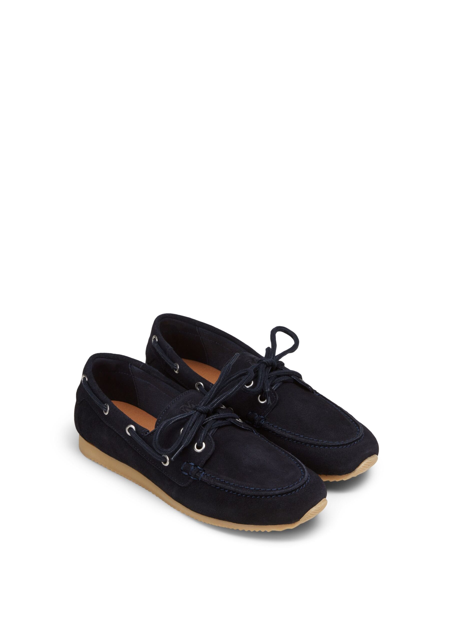 Ein klassischer Bootsschuh mit modernem Komfort. Weiches Velours-Rindleder trifft auf eine charakteristische Schnürung aus gewachster Baumwolle mit Metallösen. Das atmungsaktive Futter und die gepolsterte Innensohle aus recycelter Mikrofaser bieten hohen Tragekomfort. Die gerillte Laufsohle aus TR in Kontrastfarbe sorgt für sicheren Halt.