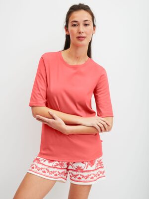 Das Damen Shirt kurz von CALIDA bietet einen lockeren Schnitt mit halblangen Ärmeln und einem Rundhalsausschnitt. Die weiche Interlock-Qualität sorgt für ein angenehmes Tragegefühl auf der Haut und eignet sich ideal für entspannte Stunden zu Hause.
