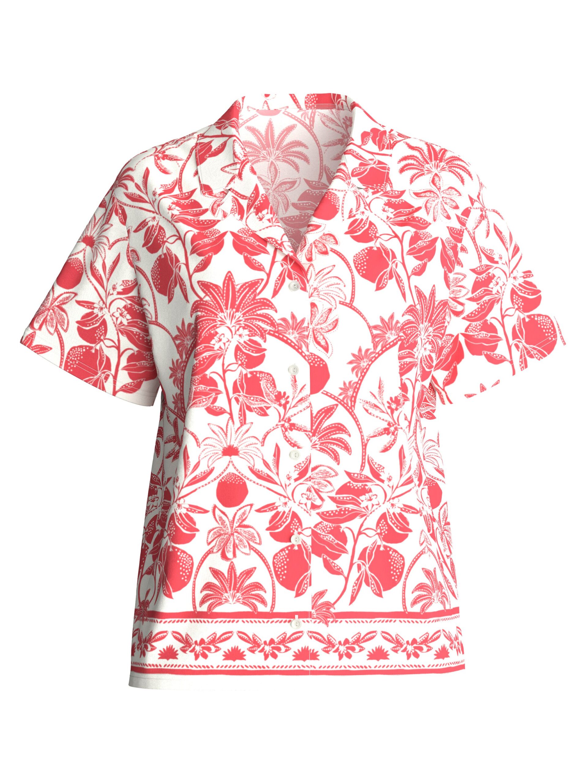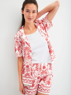 Das Damen Shirt mit kurzem Arm aus weicher Baumwollqualität bietet einen lockeren Sitz und ist ideal für entspannte Stunden zu Hause. Es verfügt über eine Knopfleiste vorne, einen dezenten Kragen und ein florales Muster mit Bordürendetail.