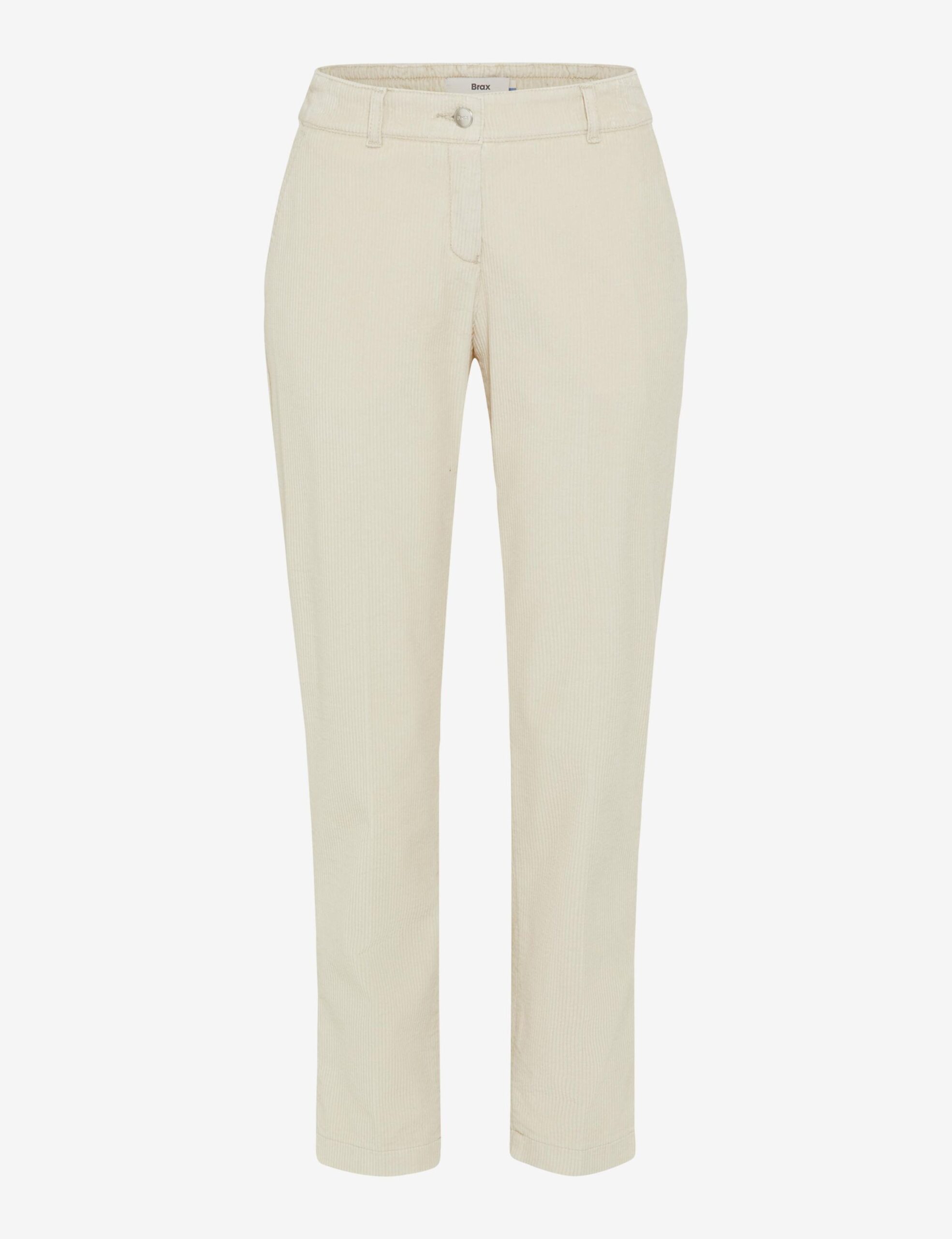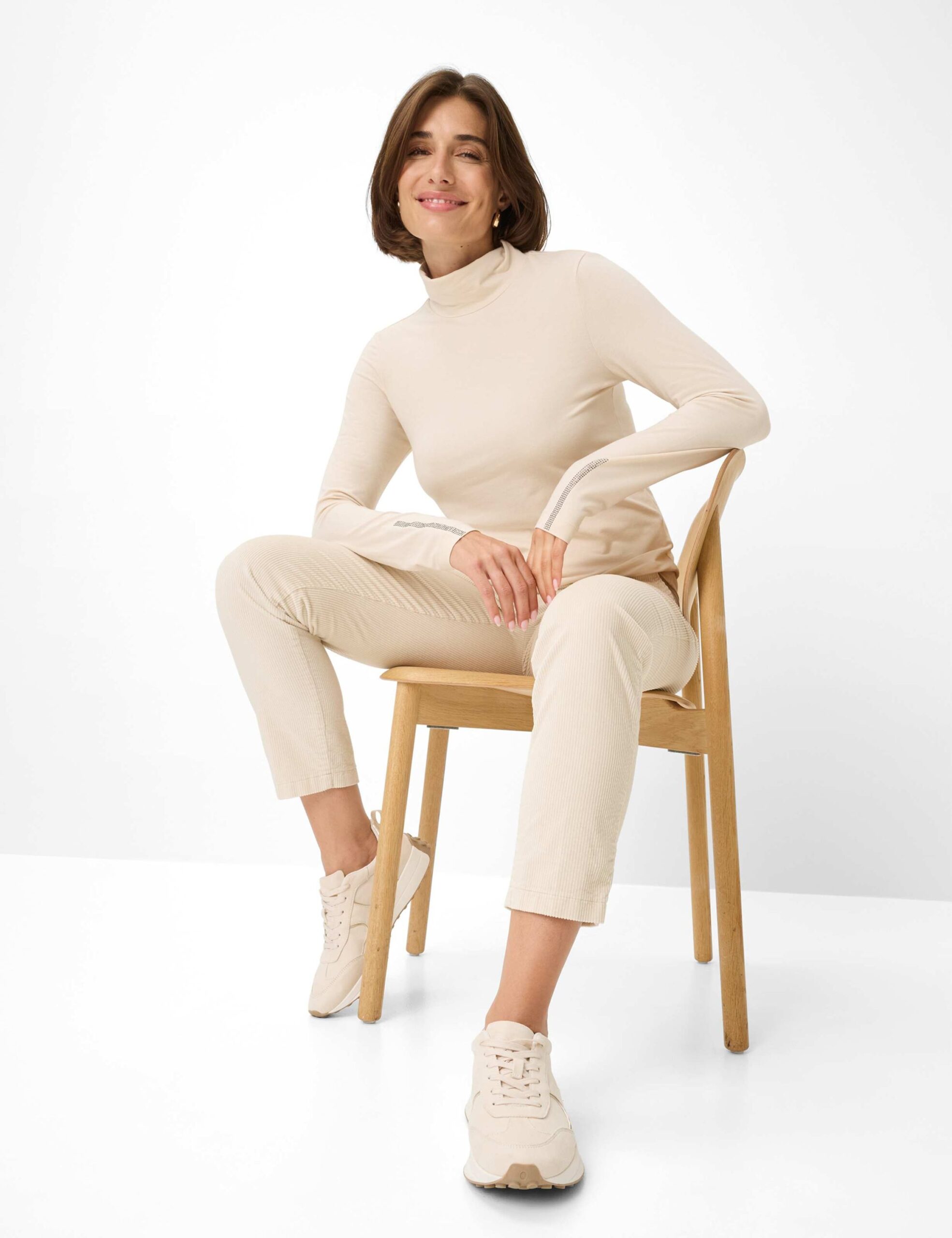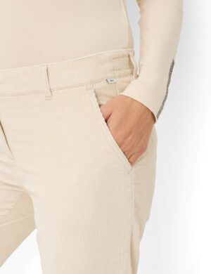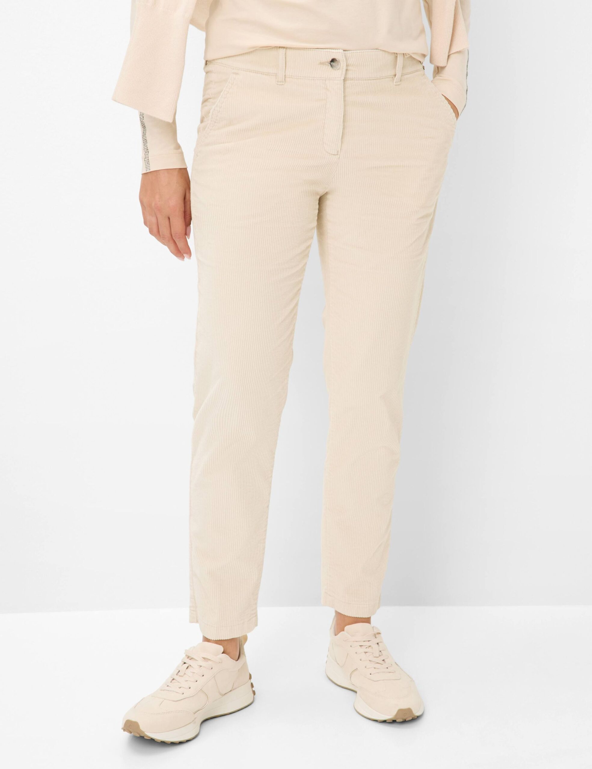 Fein gerippt und modisch auf den Punkt gebracht: Die Chino im Style MARON S zeigt, wie unkompliziert sich Komfort und Stil vereinen lassen. Mit ihrer konisch geformten Silhouette im klassischen Regular Fit bietet die Hose eine figurumspielende Passform, die besonders schmeichelhaft wirkt. Der elastische Bund mit Knopf und Reißverschluss schenkt nicht nur Tragekomfort, sondern sieht dabei auch noch gut aus. Französische Taschen und dezente Leistentaschen fügen sich harmonisch ins Gesamtbild ein und betonen den modernen Anspruch dieser 7/8-Damenhose. Optisch überzeugt die smarte Chino ebenso mit der herbstlichen Farbpalette in aktuellen Nuancen und wird so zu einem vielseitig einsetzbaren Kombipartner für die kühlere Jahreszeit. Der feine Cord bringt mit seiner typischen Rippenstruktur eine stilvolle Textur ins Spiel und verleiht der Hose eine hochwertige Anmutung. Der eingesetzte Baumwollmix mit Lyocell und Elasthan garantiert nicht nur angenehme Haptik, sondern auch eine flexible Passform, die sich jeder Bewegung anpasst. Diese Hose überzeugt durch ihr Zusammenspiel aus femininer Form und urbaner Zurückhaltung – ein stilvolles Must-have für modebewusste Herbst-Looks.
