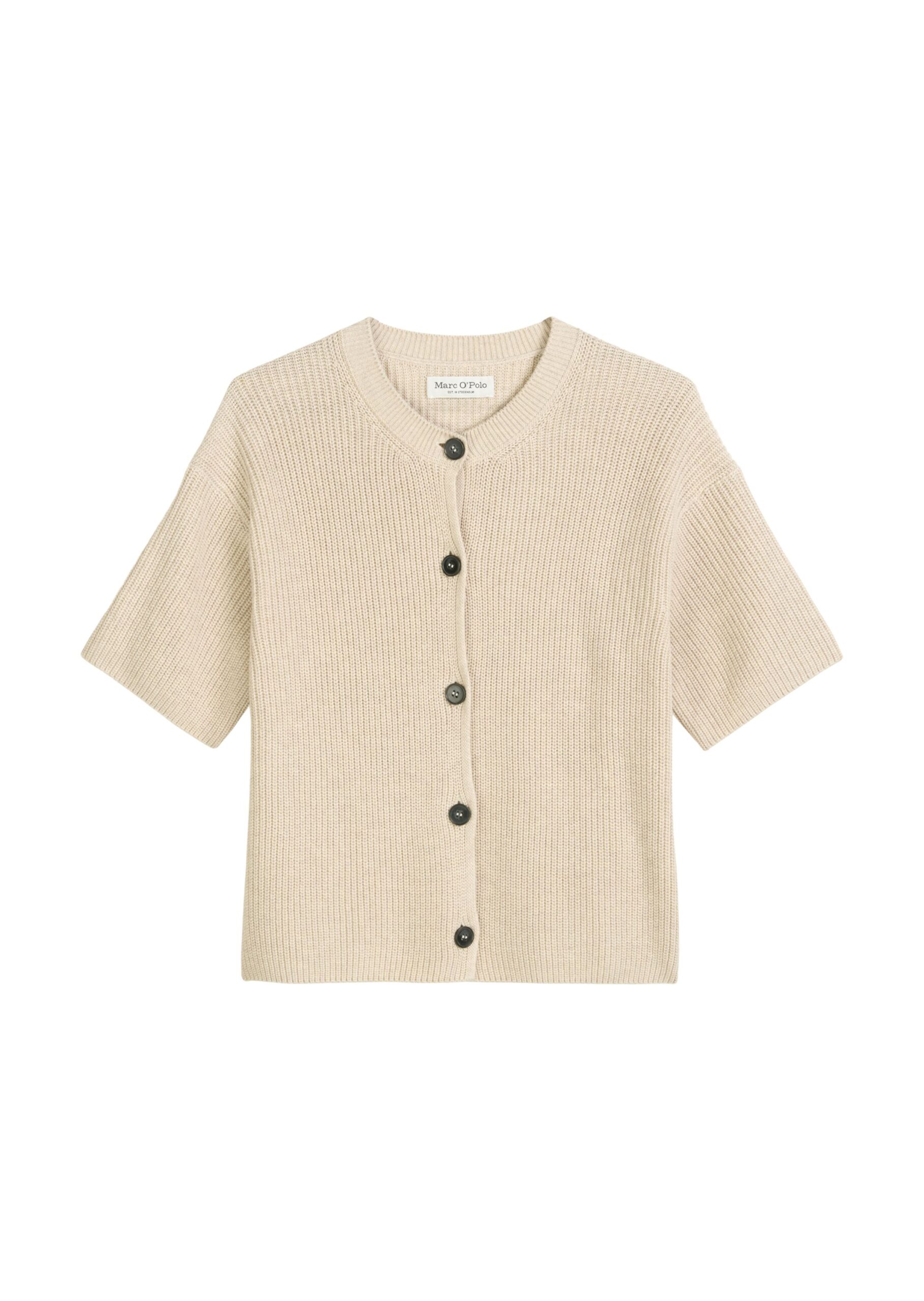 Ein lässiger Stricktrend für Sommer und Herbst: der Kurzarm-Cardigan aus reinem Bio-Baumwollgarn. Das locker geschnittene Modell hat einen gerippten Rundhalsausschnitt, überschnittene Schultern, eine geknöpfte Front und eine gerade Saumlinie. Für den angesagten Monochrome-Look zu farblich passenden Unterteilen kombinieren. Die Fully-Fashioned-Verarbeitung an Kragen, Armloch und Schulter bedeutet, dass das Kleidungsstück „auf Form gestrickt“ ist. Dieser Prozess erfordert keinen Zuschnitt und fällt damit unter die Zero-Waste-Produktion. Besonders edel ist die „französische Schulter“: Hier liegt die Schulternaht nicht am höchsten Punkt, sondern ist lässig nach hinten versetzt.