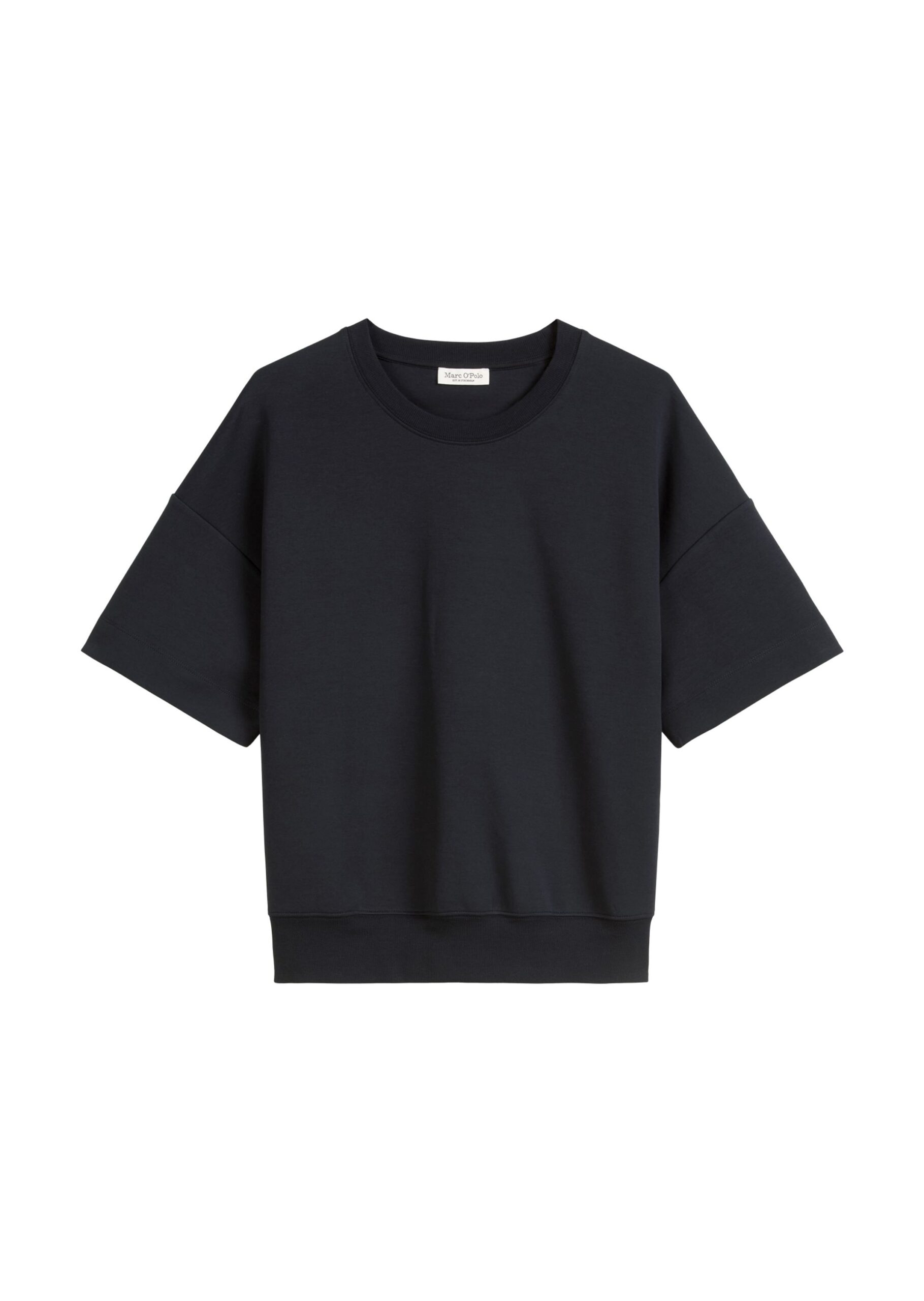 Cozy, cool, chic und eine moderne Alternative zum typischen Langarm-Sweatshirt: das Interlock-Sweatshirt mit kurzen Ärmeln. Das Modell hat einen klassisch gerippten Rundhalsausschnitt, überschnittene Schultern mit nach hinten verlegten Nähten und ein Rippbündchen am Saum. Stylingtipp für den angesagten Monochrom-Look: mit dem passenden Midi-Sweatrock kombinieren.