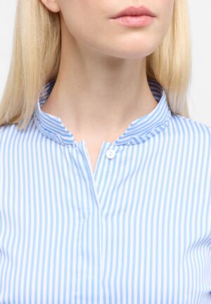 Gestreifte Blusen zählen zu den ultimativen Basics im Kleiderschrank. Diese Hemdbluse ist geschmeidig und fein schimmernd, ein elegantes Must-have für feminine Businesslooks und stilvolle Momente. Das hochwertige Satingewebe (69% Baumwolle, 27% Polyamid, 4% Elasthan) sorgt für einen perfekten Sitz der Bluse, der jede Bewegung mitmacht. Durch das Vor-Waschen des Stoffes (garmend washed) werden die Fasern aufgelockert, wodurch das Material angenehmer und weicher auf der Haut liegt. Der Stehkragen und die verdeckte Knopfleiste runden den Look dieser Fitted Bluse geschmackvoll ab. Durch die Paspelierungen wird die Kontur des Stehkragens und der Manschetten besonders betont. Die Bluse zaubert eine super-schlanke Silhouette, die durch Abnäher im Rückenteil erreicht wird und die Ihre Figur deutlich akzentuieren. Dank des Stretch-Anteils garantiert dieses Modell jedoch optimale Bewegungsfreiheit. Bestellen Sie diese geschmackvolle Bluse noch heute bequem in unserem Online-Shop!
