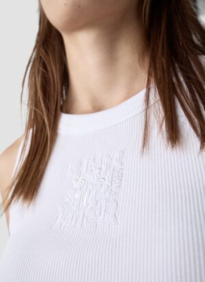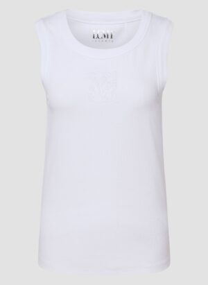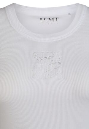 Das weiße Tanktop ‚Summer Vibe‘ von LCMT überzeugt durch seine figurbetonte Passform und den feinen Ripp-Jersey, der angenehm auf der Haut liegt. Der tonale Frontprint verleiht dem schlichten Design eine stylische Note. Ob unter einer Bluse, zum Cardigan oder solo zur Jeans – dieses Top ist ein echtes Allroundtalent. Es besteht aus weichem, elastischem Rippmaterial, hat einen klassischen Rundhalsausschnitt und ist ärmellos mit breiten Trägern.