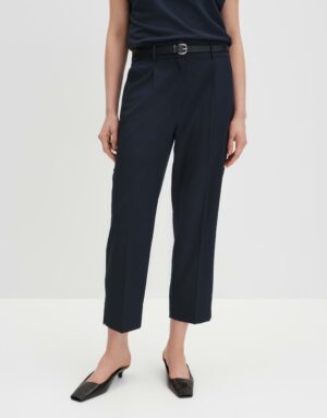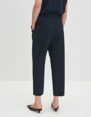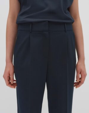 Locker geschnittene Hose mit schmal zulaufendem Bein, Hosenbein Innenlänge ca. 65 cm in jeder Größe. Das Model ist 178 cm groß und trägt Größe 36. Die Hose besteht aus Webware mit natürlichem Griff und fließendem Fall. Sie ist pflegeleicht und verfügt über französische Taschen, eine Zier-Paspeltasche hinten, Bundfalten, Bügelfalten, einen verdeckten Zip-Fly, einen Gummibund hinten und Schlitze am Saum.