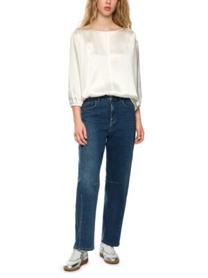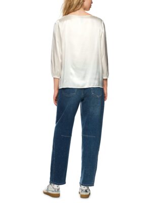 Die lockere Seidenbluse von Marc Cain Additions präsentiert einen weiten Rundhals und dreiviertellange Ärmel. Das hautschmeichelnde Material sorgt für hervorragendes Trageverhalten. Das Model ist 179 cm groß und trägt N3/38.