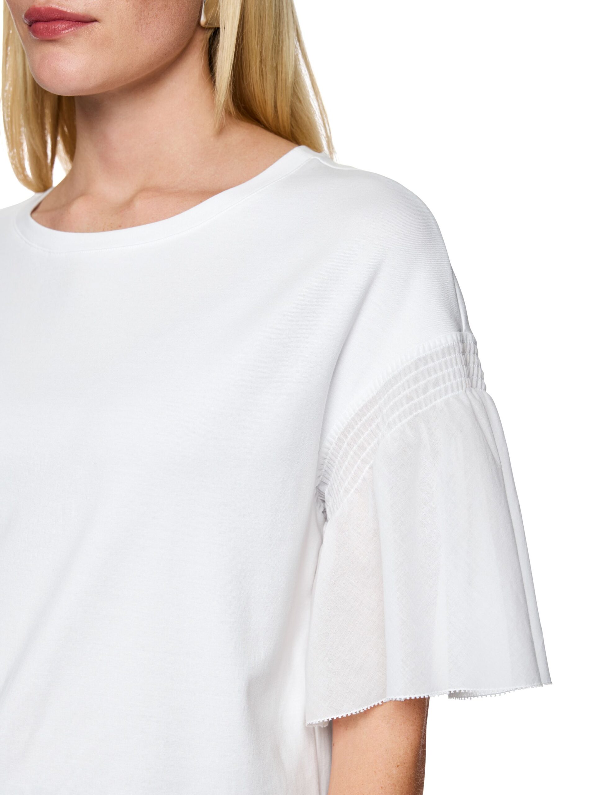 Das Baumwollstretch-Shirt mit Smokdetails besticht durch seinen lockeren Schnitt und die weiten, halblangen Ärmel. Der klassische Rundhalsausschnitt und das elastische Material sorgen für hohen Tragekomfort. Ein raffiniertes Smokdetail an den Ärmeln verleiht dem Shirt eine modische und feminine Note. Das Model ist 179 cm groß und trägt Größe N3/38.