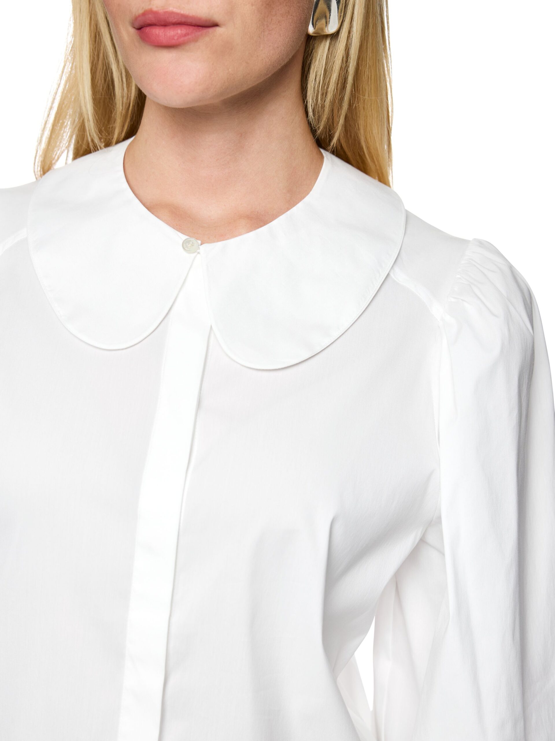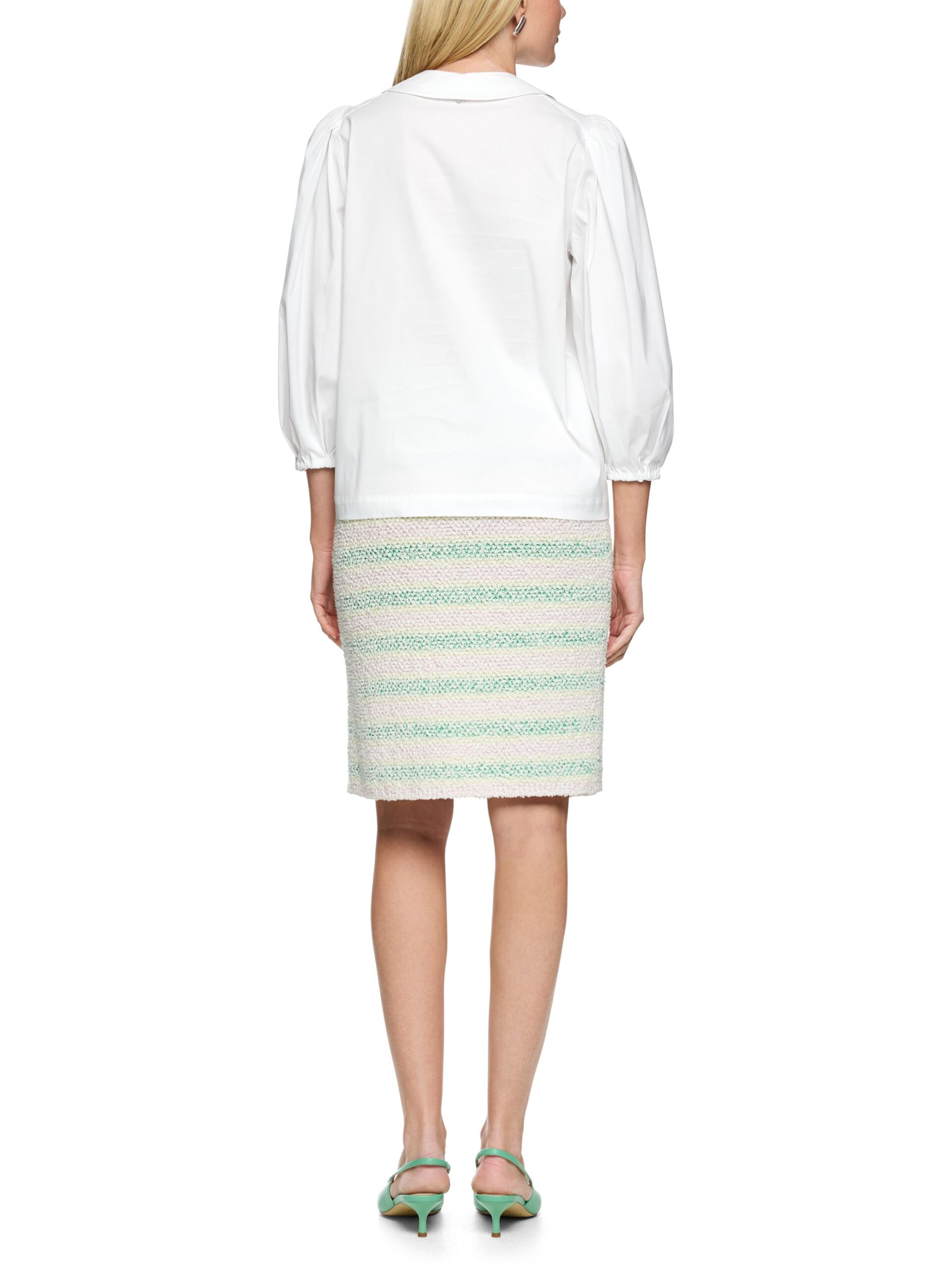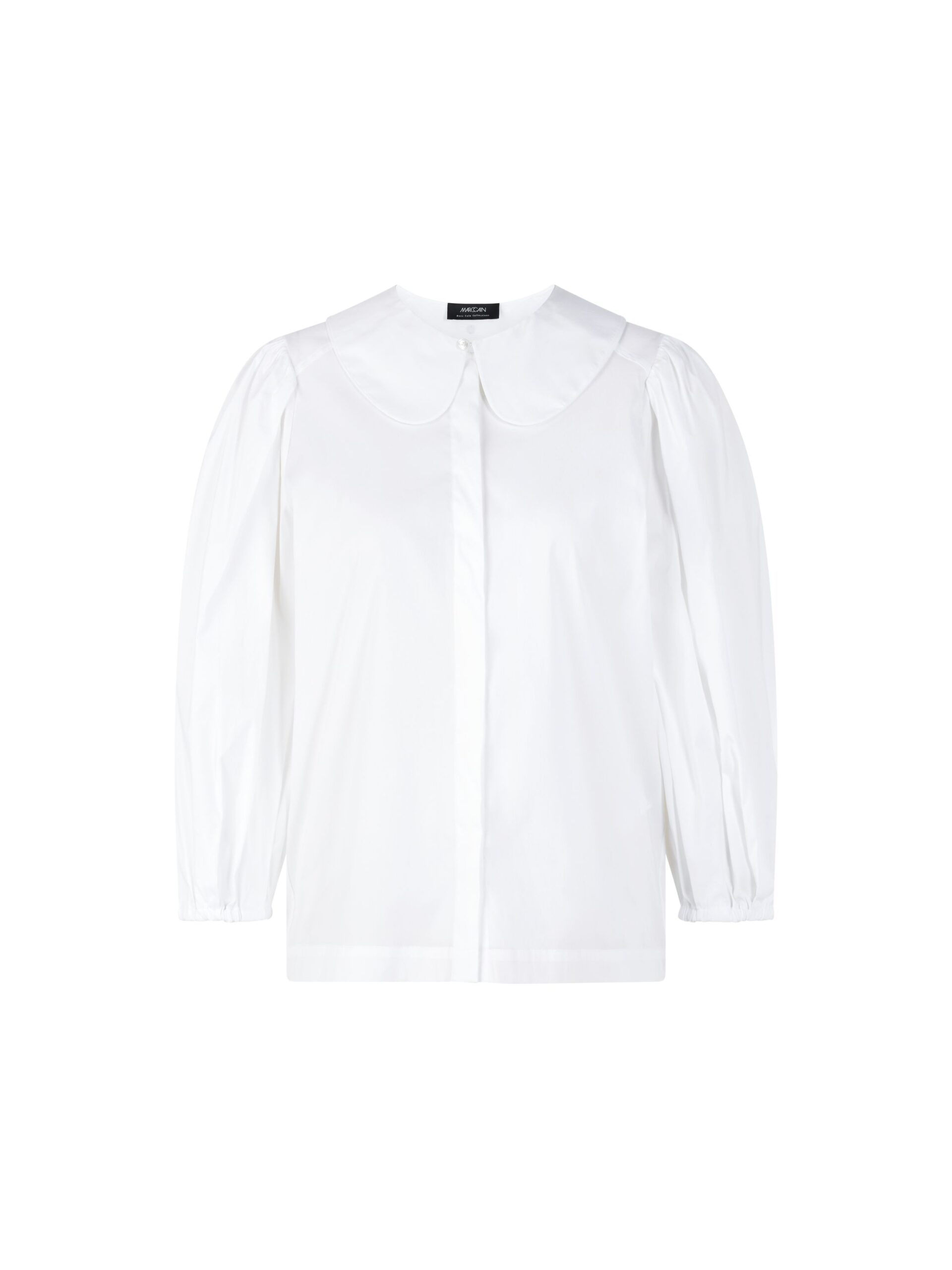Gerade geschnittene Bluse mit dreiviertellangen, voluminösen Ärmeln, die in schmalen Gummibändern enden und trendige Akzente setzen. Die Bluse verfügt über eine verdeckte Knopfleiste und einen abnehmbaren, gerundeten Kragen, der flexible Styling-Varianten ermöglicht. Das Model ist 179 cm groß und trägt N3/38.