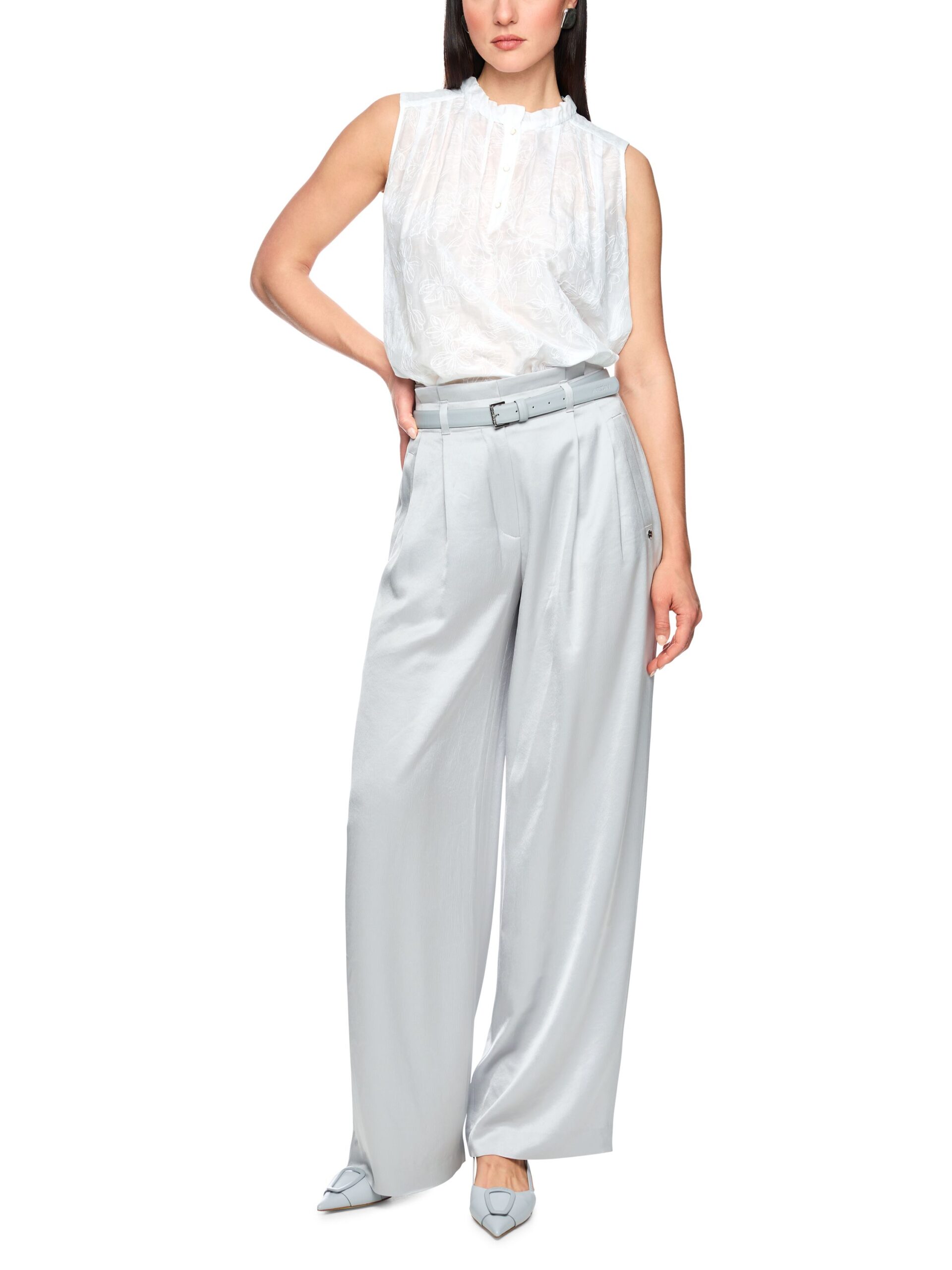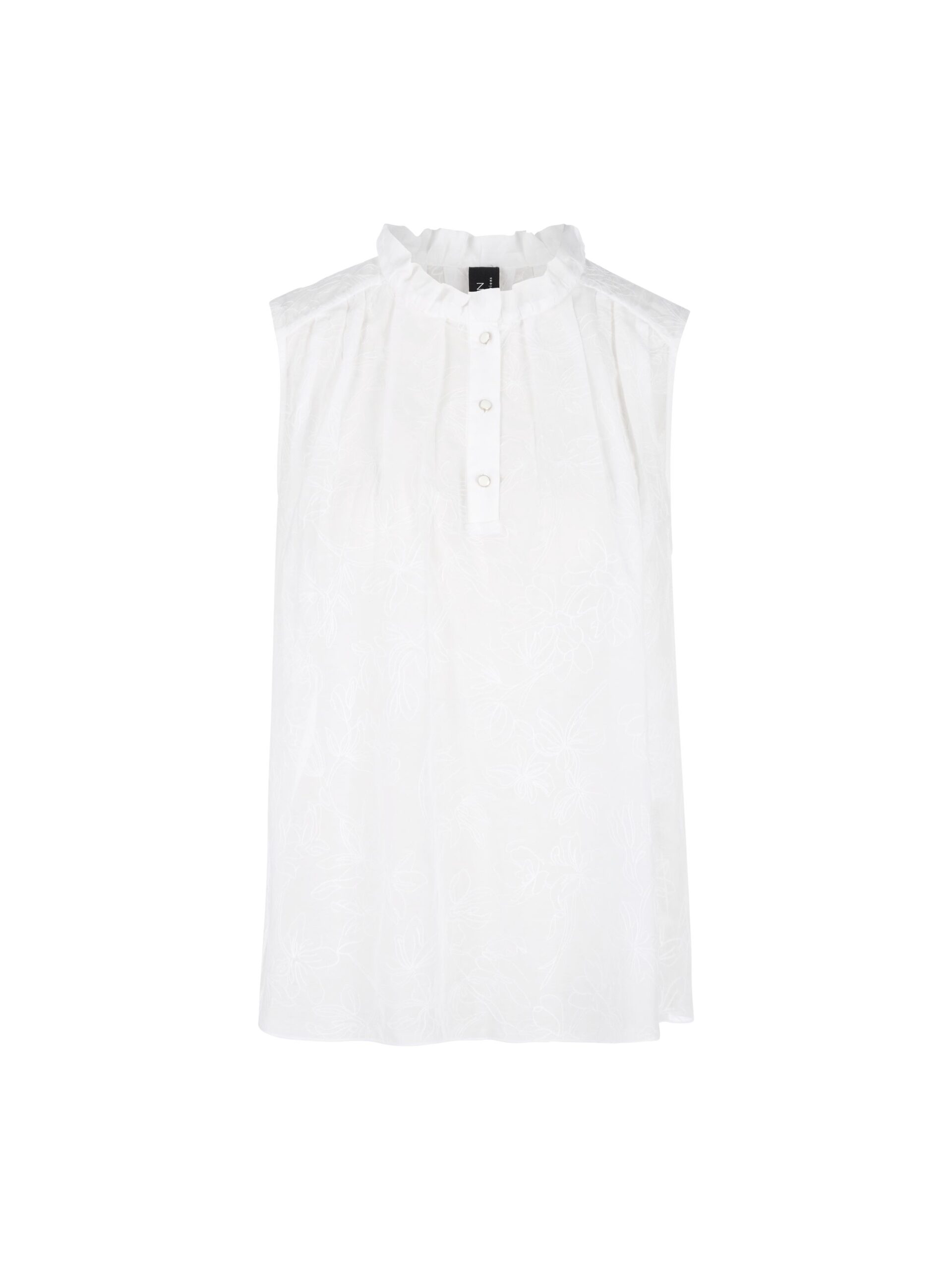 Das Top mit Rüschen und Blumenstickerei aus einer Baumwoll-Seide-Mischung besticht durch seinen legeren Schnitt und den weichen Griff. Es eignet sich ideal für leichte Layering-Looks oder als edles Einzelstück. Das florale Stickmuster und die Rüschen am Ausschnitt setzen feminine Akzente. Das Model ist 179 cm groß und trägt Größe N3/38.
