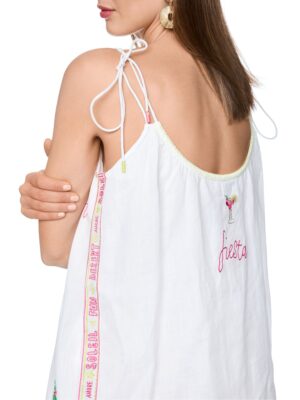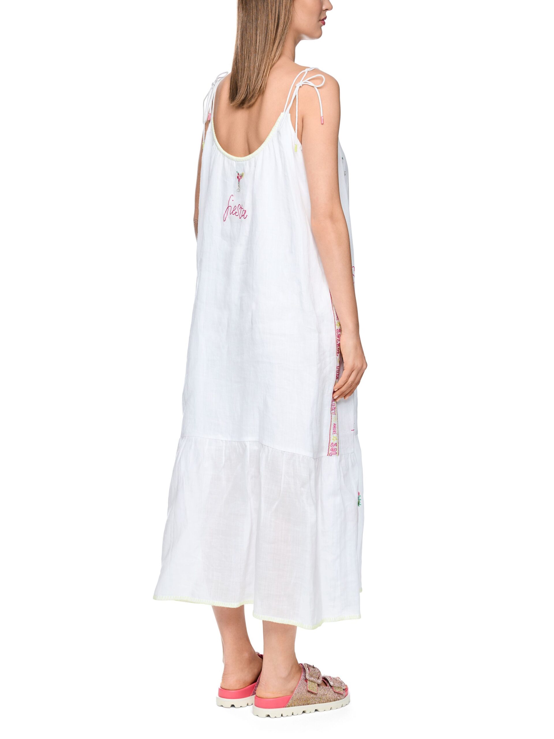 Das ärmellose Midikleid aus Ramie besticht durch farbenfrohe Stickereipatches im Desert Fiesta-Thema auf weißem Grundstoff. Mit Zierstich am Halsausschnitt und Saum, einem Volant am Saum und dünnen Trägern mit farbigen Kordelstoppern. Perfekt für sommerliche Looks.