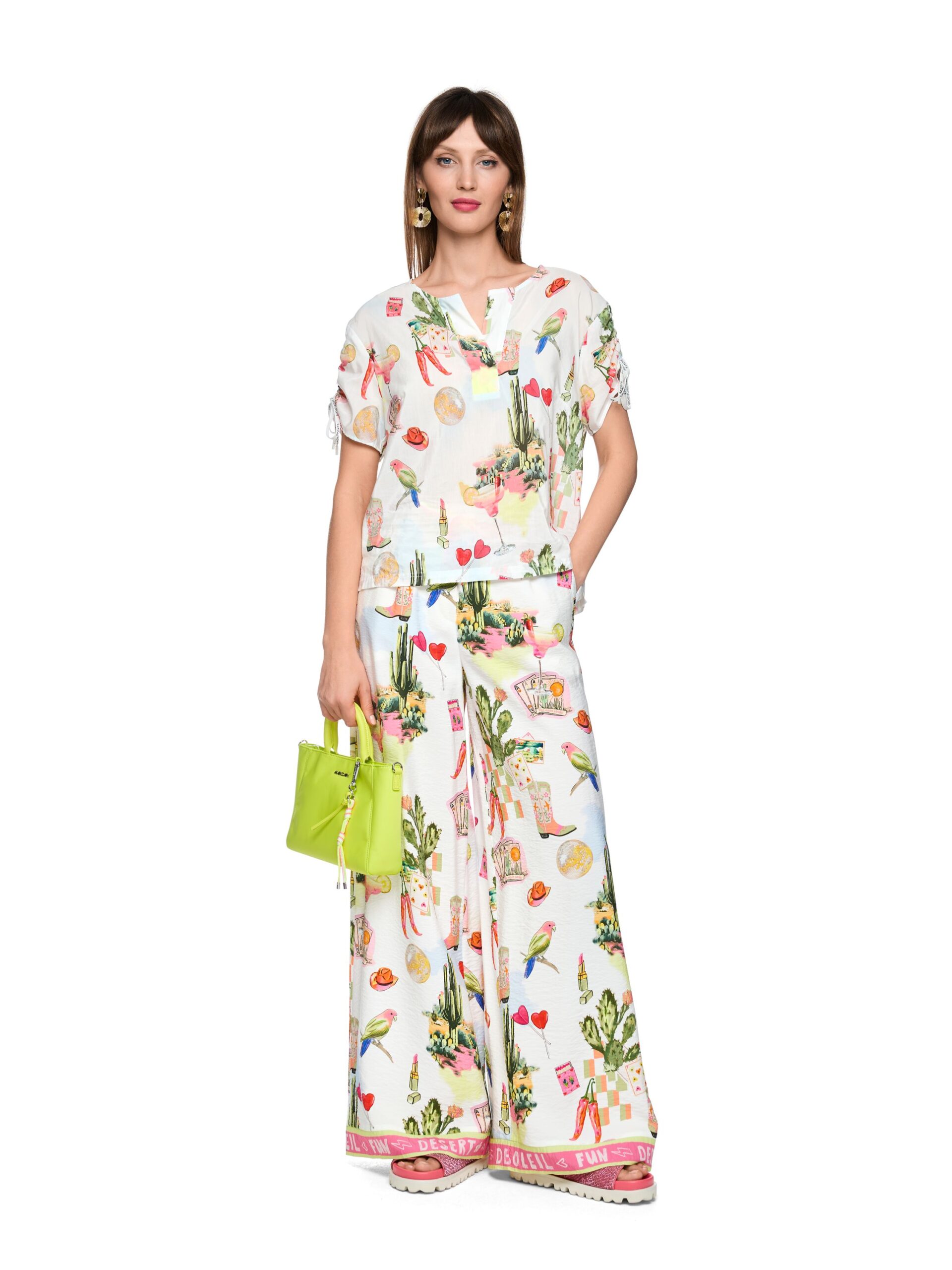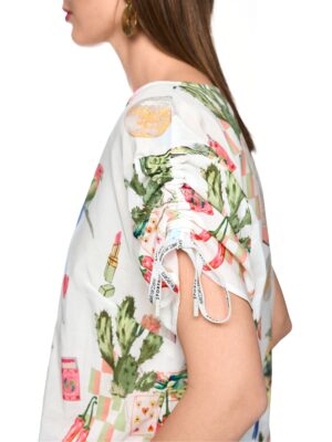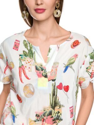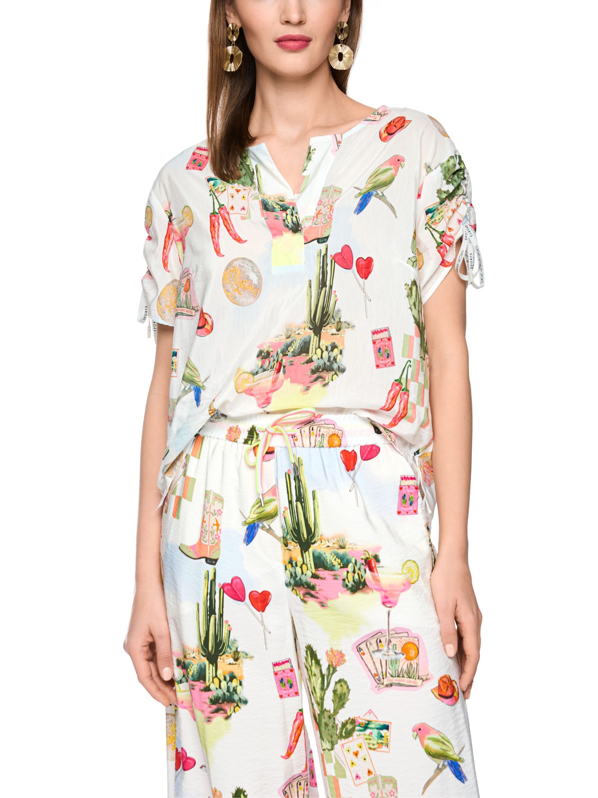 Das Blusenshirt mit Raffdetails und Allover-Desert-Fiesta-Print bietet einen lockeren Fall und sommerlich-leichten Look. Die Ärmel sind individuell raffbar und in variabler Länge tragbar. Ideal kombinierbar zu Shorts, Röcken oder Jeans.