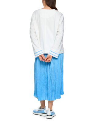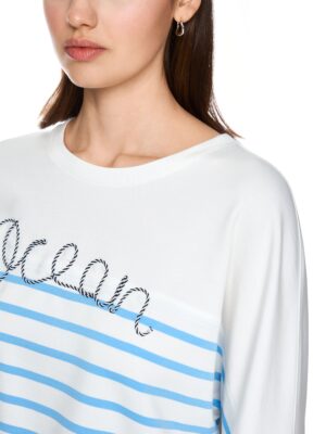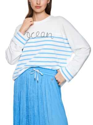 Das gestreifte Sweatshirt in weiter Form mit überschnittenen Schultern und Rundhals Ausschnitt besticht durch sein maritimes Streifenmuster und die „Ocean“ Stickerei auf der Vorderseite. Der weiche Materialmix liegt angenehm auf der Haut. Kleine seitliche Schlitze mit Knöpfen sorgen für einen besonderen Look. Das Model ist 179 cm groß und trägt Größe N3/38.