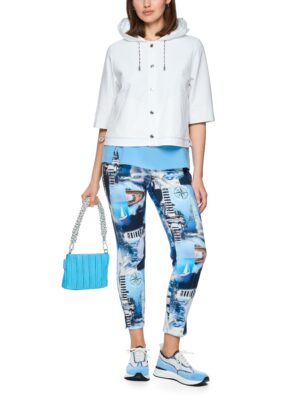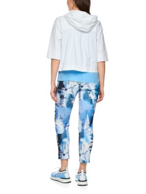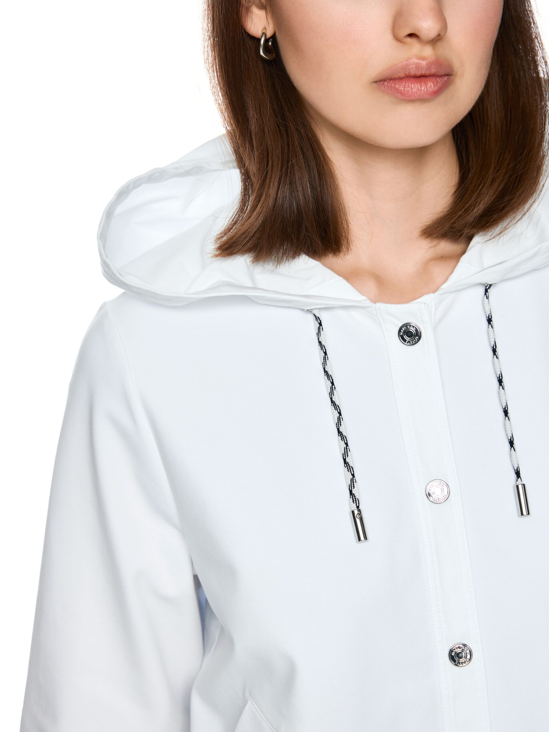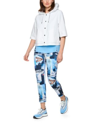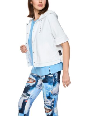Die kurze Jacke von Marc Cain Sports überzeugt mit einem sportlichen Materialmix und einem weiten, lässigen Schnitt. Die verkürzten Ärmel, die Kapuze und das Rückenteil aus einem dünneren Material sowie die seitlichen Taschen und das Zugband am Saum machen die Jacke zu einem praktischen Begleiter für den Alltag. Geschlossen wird sie mit einer Druckknopfleiste. Das Model ist 179 cm groß und trägt Größe N3/38.