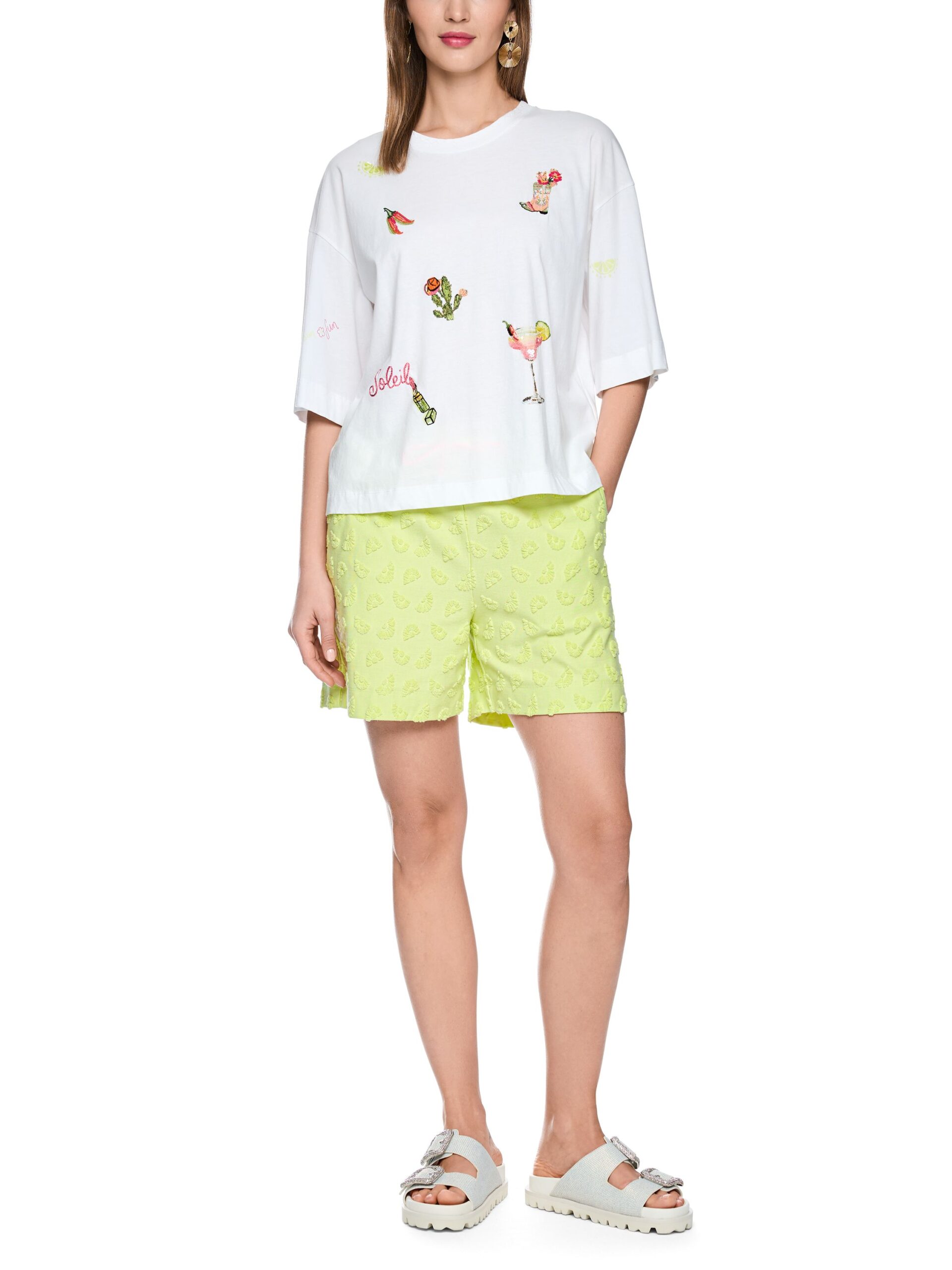Das Shirt mit 3/4-Ärmeln und Patches von Marc Cain Sports ist ein locker geschnittenes Oberteil mit farbenfrohen Stickereipatches auf der Vorderseite, verziert mit Pailletten und Perlen. Es hat einen Rundhalsausschnitt und einen weichen Griff. Ideal kombinierbar zu Hosen, Röcken oder Shorts für einen lebendigen Sommer-Look. Das Model ist 179 cm groß und trägt Größe N3/38.
