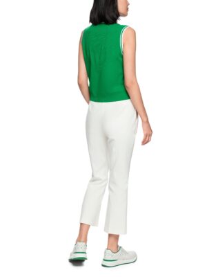 Das Stricktop mit Ajourmuster von Marc Cain Sports ist leger geschnitten und ärmellos. Es verfügt über einen Kragen mit kurzer Knopfleiste und ist vielseitig kombinierbar. Das Top eignet sich ideal für sommerliche Outfits mit stilvoller Leichtigkeit. Das Model ist 179 cm groß und trägt Größe N3/38.