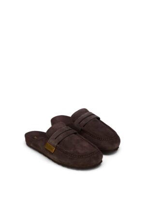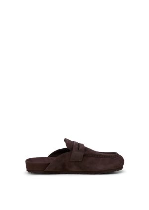 Moderner Mules-Schuh aus hochwertigem Veloursleder mit markanter Pennyloafer-Spange und rutschhemmender Laufsohle.