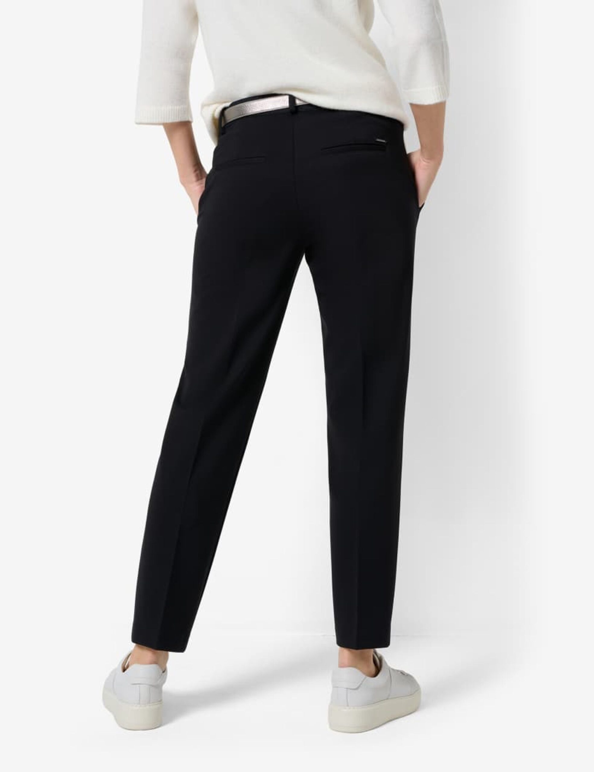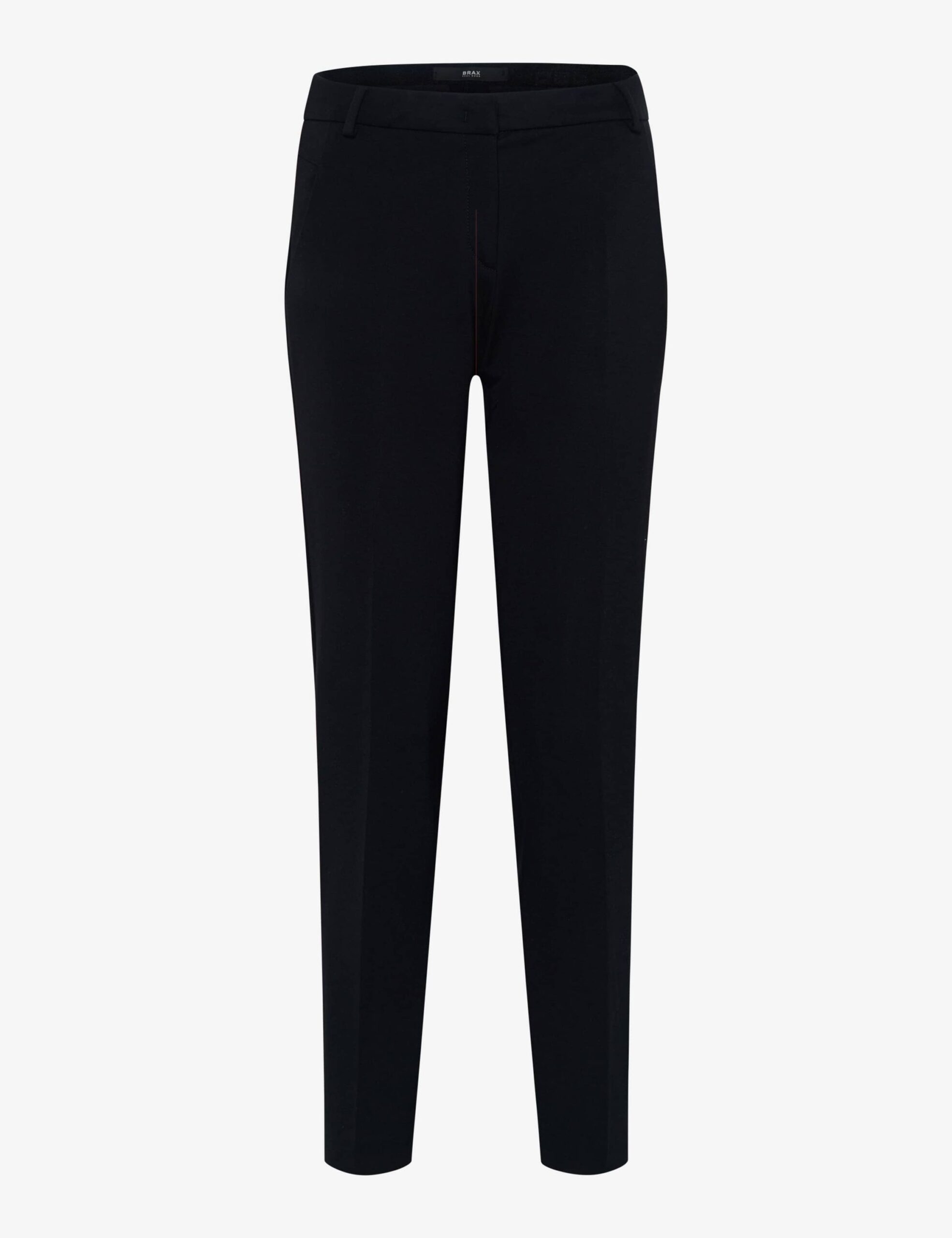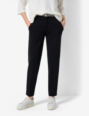 Die BRAX Style MARON S ist eine klassische Damenhose, die sich ideal mit Blusen kombinieren lässt. Der konische Schnitt und die niedrige Taille sorgen für eine komfortable Passform. Die Hose verfügt über Reißverschlusstaschen, dekorative Teilungsnähte und ein aufwendiges Taschendesign. Der fein gewirkte Jersey aus einem Viskosemix bietet ein erstklassiges Tragegefühl.
