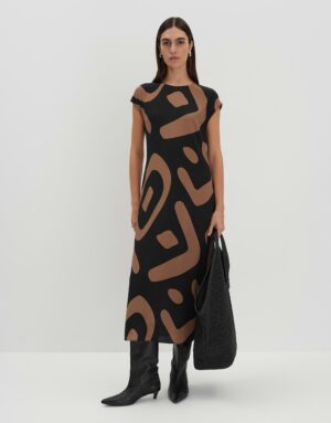 Figurbetonte Passform, tailliert, Maxi-Länge, überschnittener Kurzarm, hoher Rundhalsausschnitt, Rückenlänge ca. 125 cm bei Größe 36, Model Größe 176 cm – trägt Größe 36, Webware, dezente Struktur, natürlicher Griff, fließender Fall, All-Over-Print, Knopf mit Öse im Rücken, Schlitz hinten, Teilungsnaht hinten