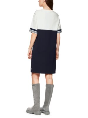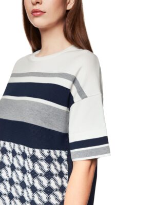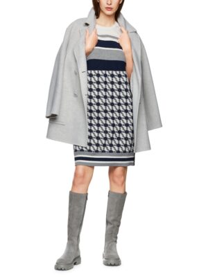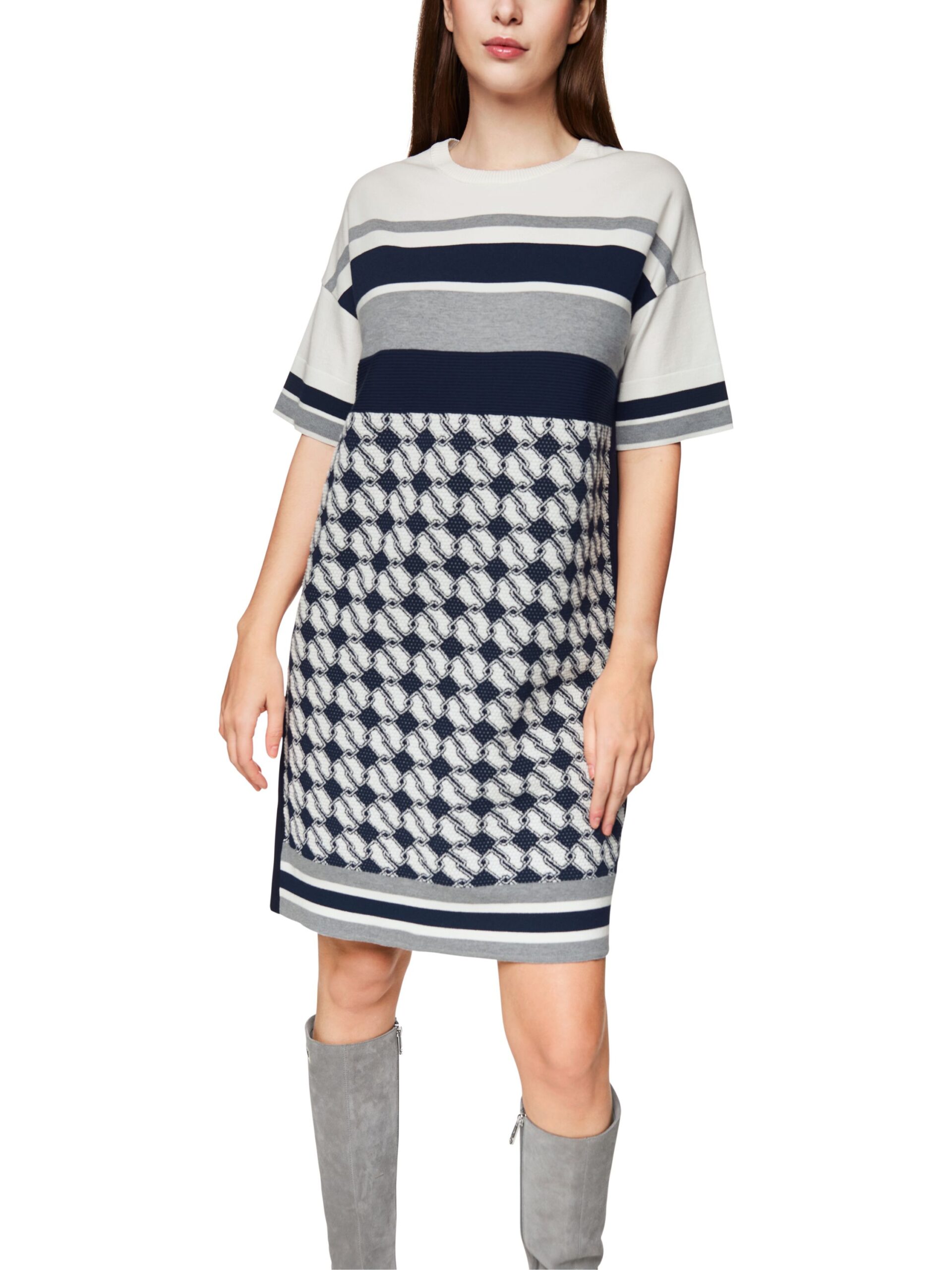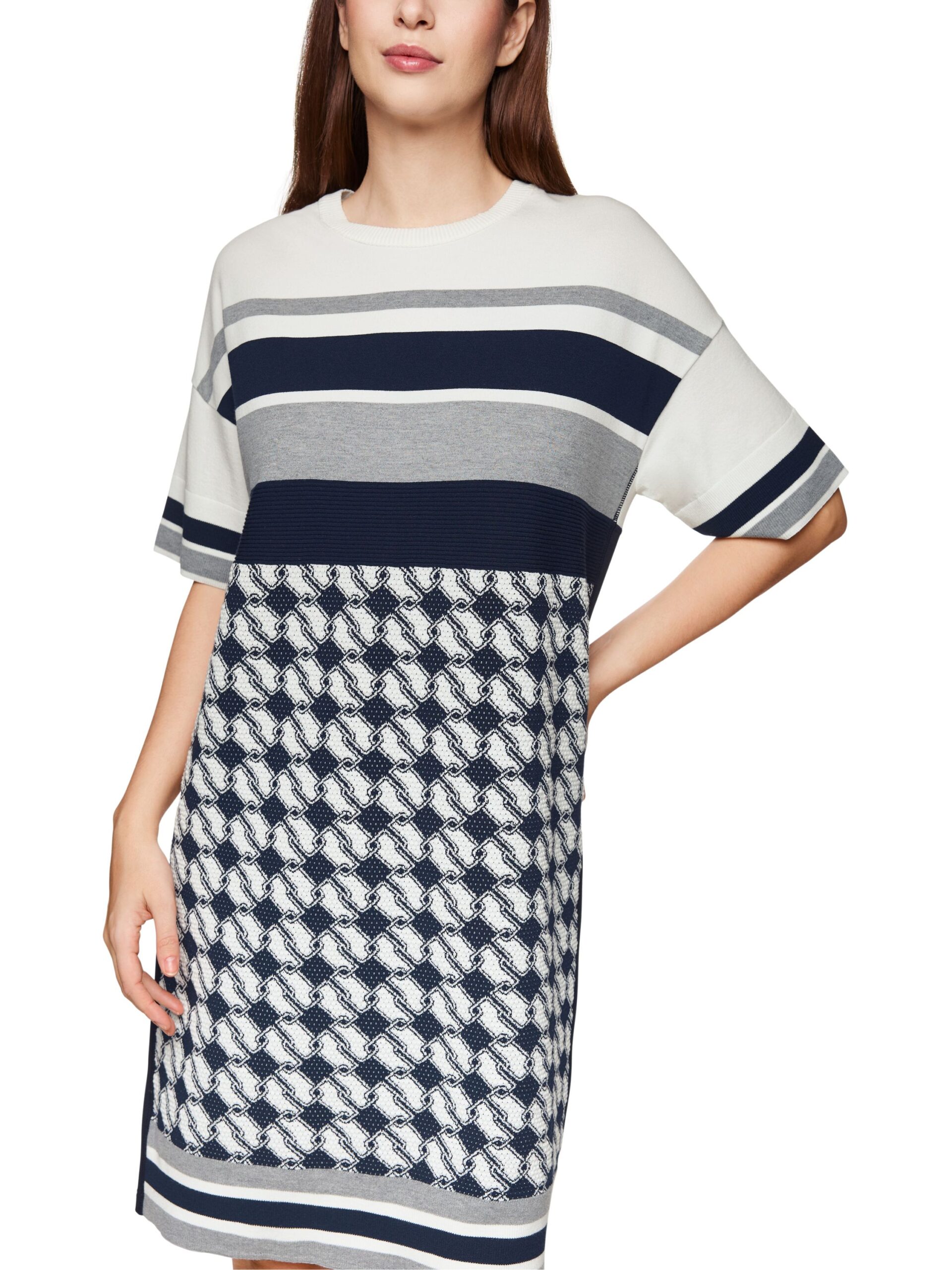 Knielanges Strickkleid mit neuem Cube-Design, gefertigt aus einem trageangenehmen Viskosemix. Das Modell ist ‚Knitted in Germany‘: Das Verstricken der Garne auf hochmodernen Strickmaschinen und die Veredelung der Stoffe geschehen am Standort Deutschland. Zusammengenäht werden die einzelnen Teile, wie Ärmel, Vorderteil etc., in europäischen Partnerbetrieben. Leger geschnitten mit weiten, halblangen Ärmeln und rundem Halsausschnitt. Das Model ist 179 cm groß und trägt N3/38.