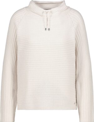Der Pullover besticht durch sein zeitloses Design mit patentierter Querrippe und einem modischen Stehkragen mit Bindeband.