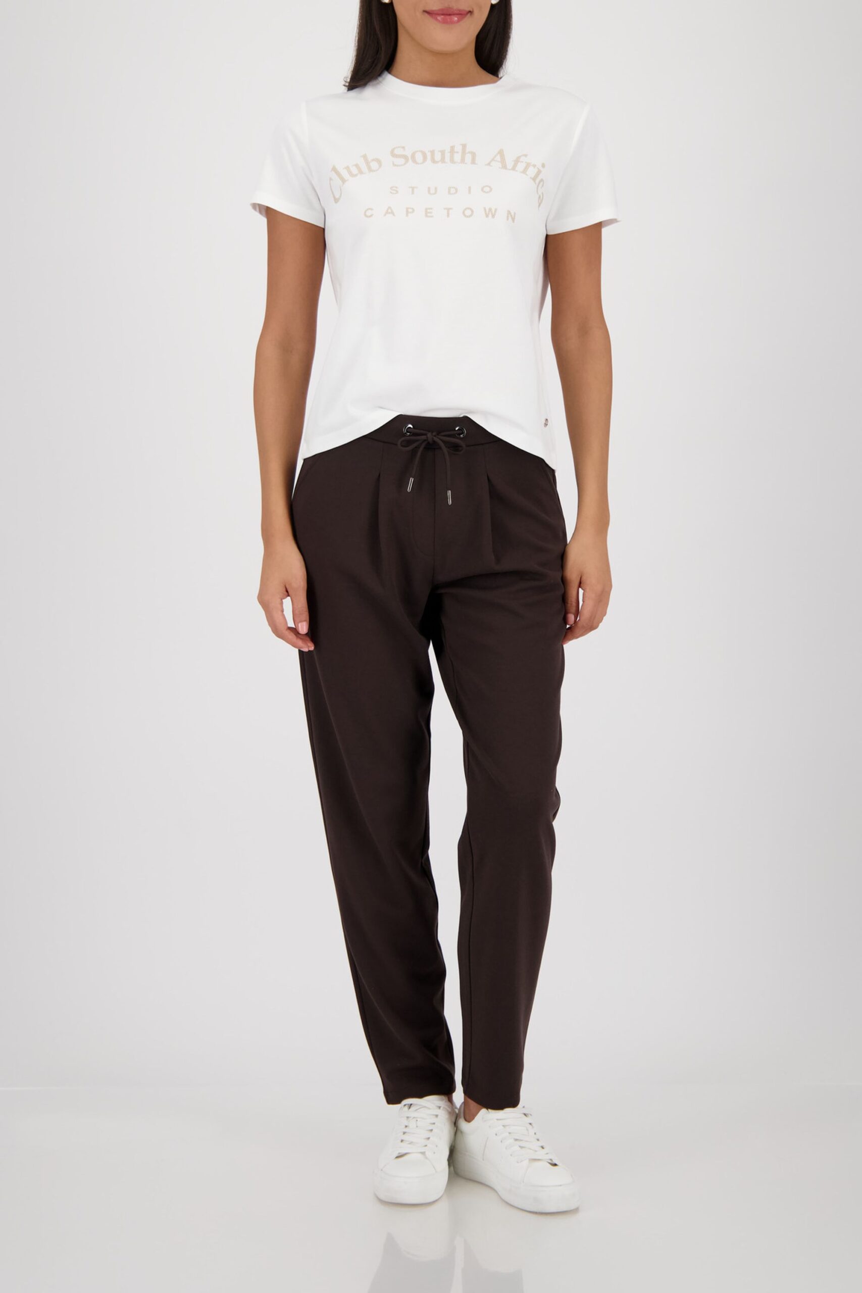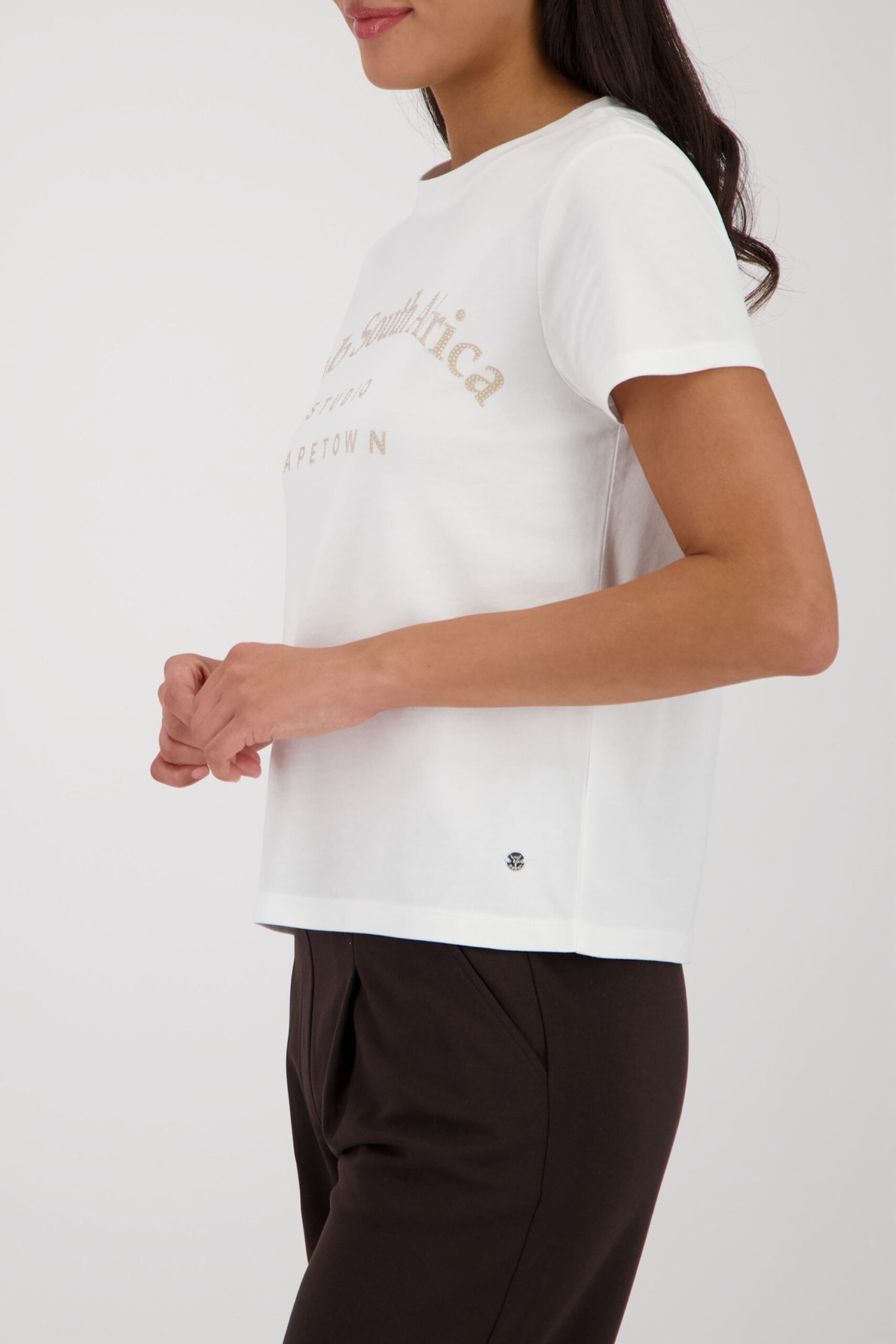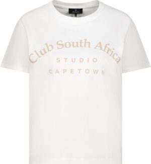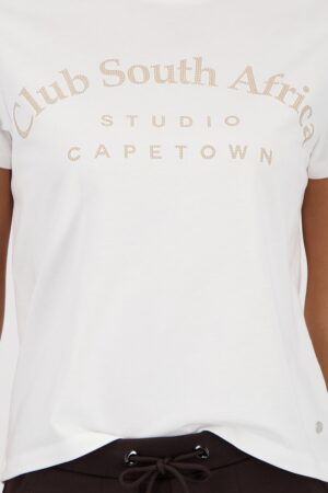 Entdecken Sie unser stilvolles T-Shirt aus einer hochwertigen Baumwolle mit Modal, verziert mit Strasssteinen und dem eleganten „Club South Africa“-Schriftzug.