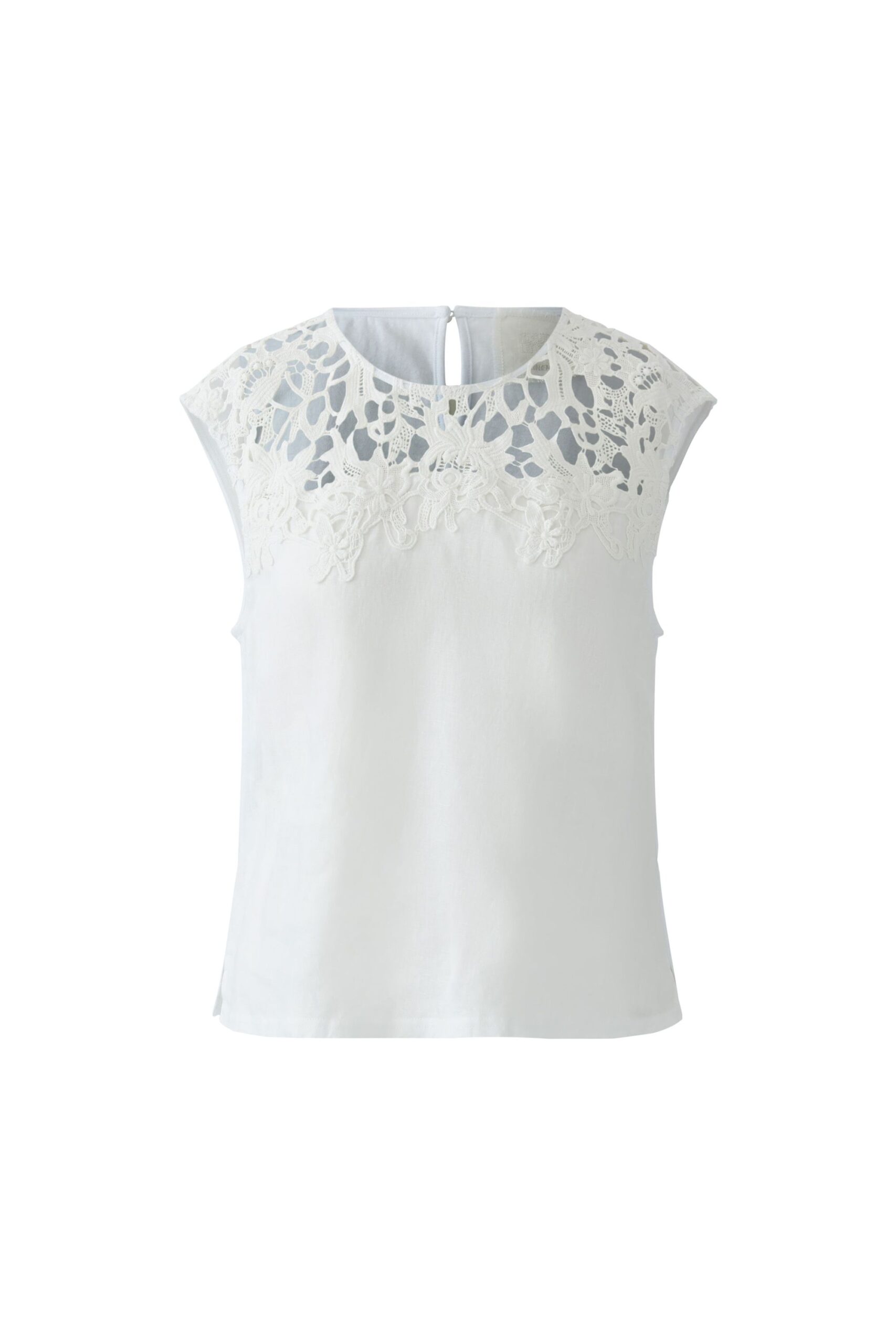 Das Top besteht aus reinem Leinen vorne und bequemem Baumwolljersey am Rücken. Es ist gerade geschnitten und verfügt über einen Rundhals mit Schlitz und Knopfverschluss hinten. Zusätzlich hat es Schlitze in der Seitennaht. Die Länge beträgt bei Größe 36 ca. 56cm.