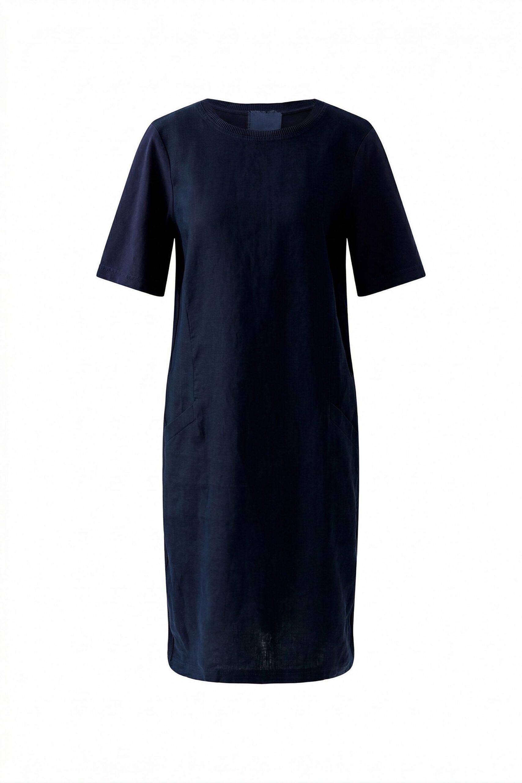 Das gerade geschnittene Kleid aus reinem Leinen besticht durch seinen tonalen Jerseybaumwollpatch im Rücken und am Arm. Es ist knieumspielend lang und verfügt über einen Rundhals mit Rippbündchen und Glanzgarn. Der Halbarm und die figurschmeichelnde Schnittführung mit integrierten Einschubtaschen machen dieses Kleid zu einem vielseitigen Begleiter. Länge bei Größe 36: 92cm.