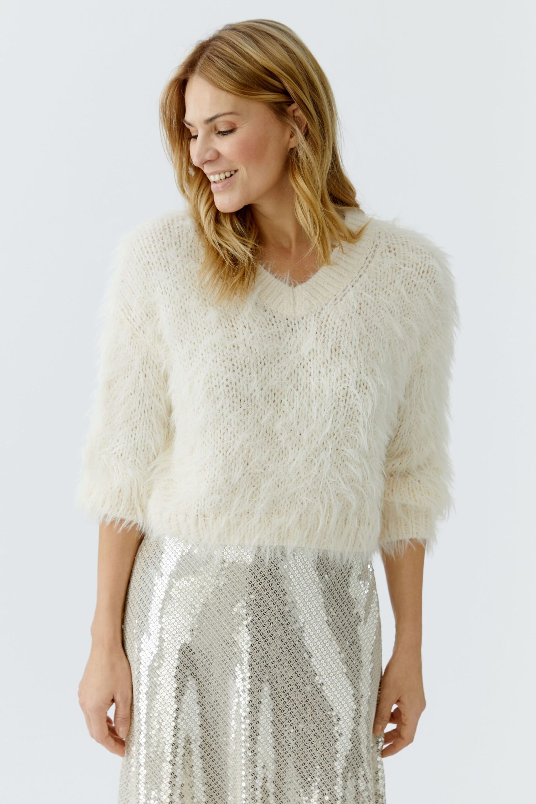 Der Pullover aus glattem Fellchengarn ist kuschelig weich und boxy geschnitten. Mit überschnittenen Schultern und Elasthan-verstärkten Strickbündchen an Ärmeln und Saum. Länge bei Größe 36: 48cm.