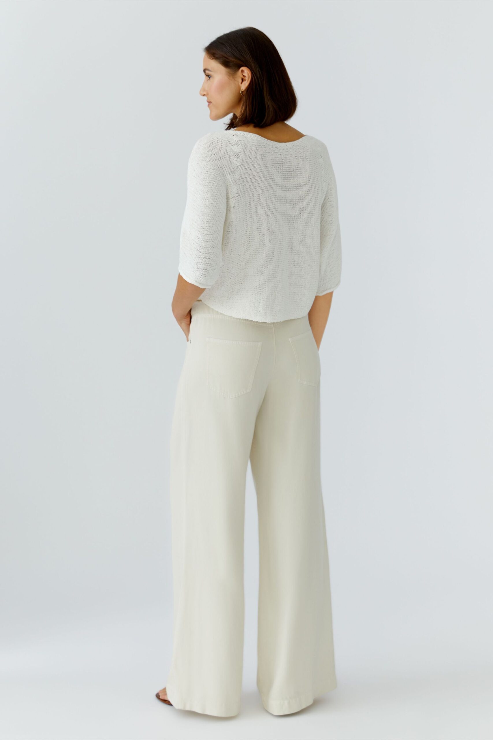 Der Pullover von Oui ist aus Bändchengarn in bewährter Baumwollmischung gefertigt und zeichnet sich durch sein Zopfdetail in angedeuteter Raglanlinie aus. Mit lässigem Schnitt, verkürzter Länge, kragenlosem U-Boot Ausschnitt und gerundeter Saumlinie ist er ein vielseitiges Basic für die Garderobe. Die glatte horizontale Strickweise verleiht ihm eine moderne Optik. Länge bei Größe 36: 46cm.