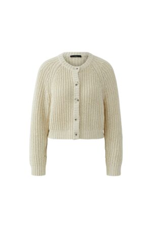 Die Strickjacke von Oui ist lässig geschnitten und aus OSKAR Bändchengarn in Rippe gestrickt. Sie verfügt über einen Rundhals mit gedoppeltem Strickbündchen, lange Ärmel mit tief eingesetztem Raglan und eine durchgehende Knopfleiste mit wertigen Knöpfen in Hornoptik. Die Länge in Größe 36 beträgt 44cm.