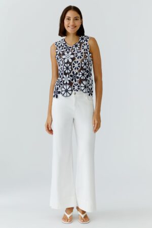 Das Stricktop aus reiner Baumwolle in Warp Technik ist schmal geschnitten und verfügt über ein Blumendesign in Makramee Optik. Es hat einen runden Ausschnitt vorne und hinten, der identisch ist. Die Abschlüsse ergeben sich aus den Blütenformen, zwischen denen transparente Netzstrukturen zu sehen sind. Die reguläre Länge bei Größe 36 beträgt 58cm.
