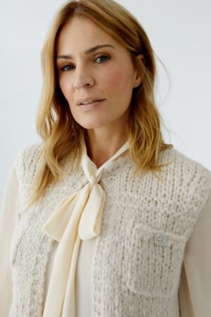 Die Strickweste von Oui aus ANGEL Garn ist super kuschelig und glatt gestrickt. Sie ist schmal geschnitten, hat eine verkürzte Länge und einen Rundhalsausschnitt. Die Weste verfügt über vier aufgesetzte Taschen mit Schmuckknöpfen und wird mit einem Haken verschlossen. Länge bei Größe 36: 50cm.