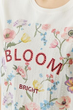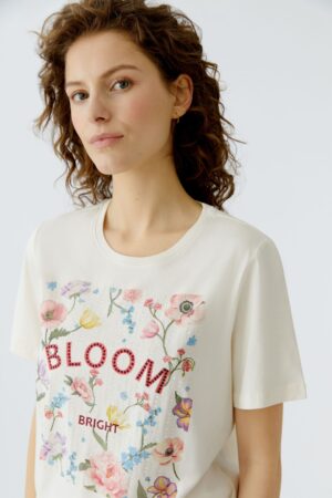 Das gerade geschnittene T-Shirt aus reiner Bio-Baumwolle besticht durch seinen platzierten Druck und die glitzernden Dekosteine. Es verfügt über einen Rundhalsausschnitt mit Blende und ein klein gestricktes Dreieck hinten am Kragen. Die reguläre Länge beträgt 62cm (Größe 36).