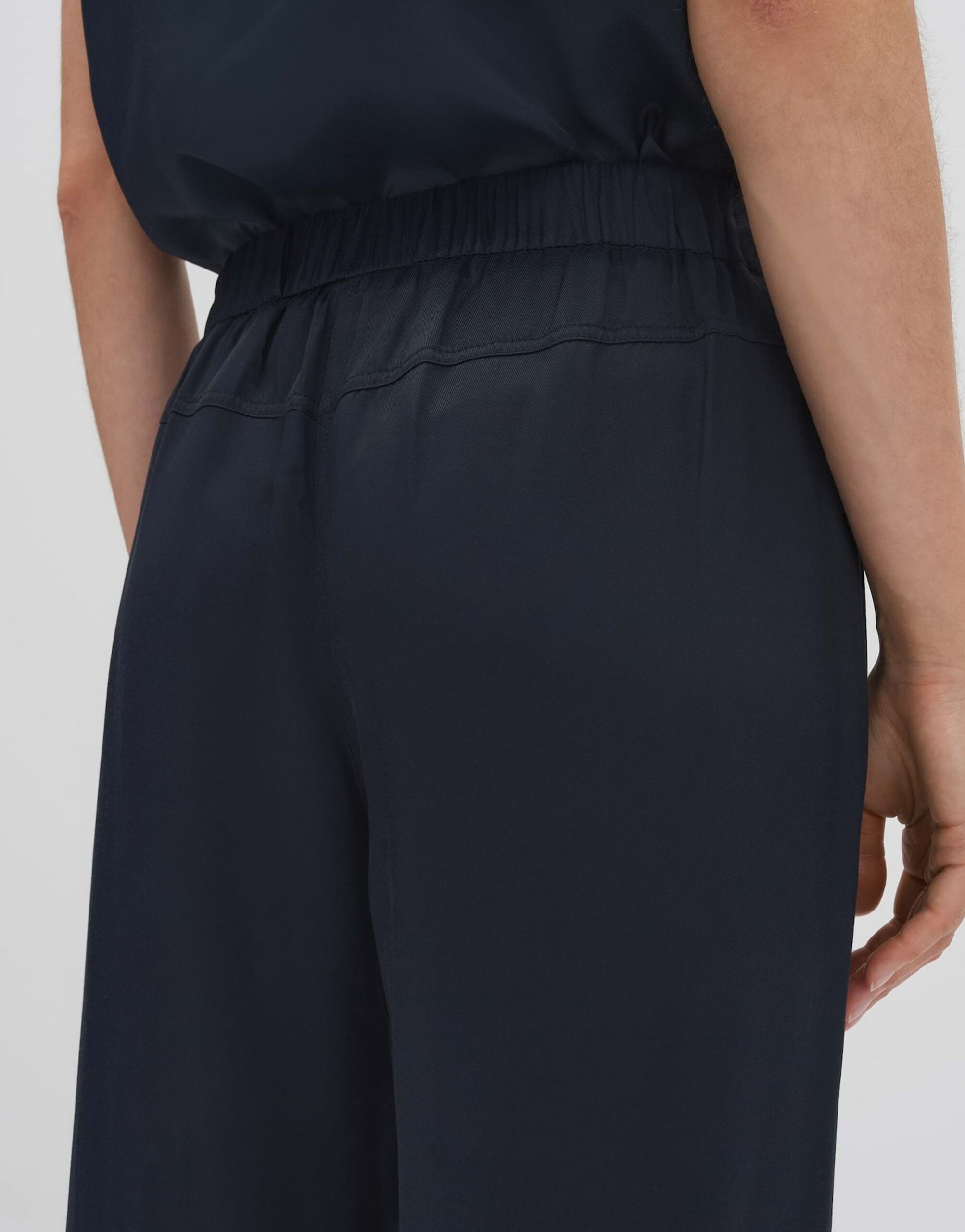 weiter, gerader Beinverlauf, Hosenbein Innenlänge ca. 79 cm in jeder Größe, Model Größe 176 cm trägt Größe 36, Webware, dezente Twillstruktur, glatter Griff, fließender Fall, dezenter Schimmer, Eingrifftaschen in den Seiten, Gummibund hinten