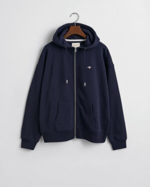 Diese Sweatjacke kommt im Relaxed Fit. Daher sollten Sie sie eine Größe kleiner bestellen, wenn Sie eine körpernahe Passform bevorzugen. Die Jacke verfügt über eine Kapuze mit Kordelzug, einen Reißverschluss vorne, Rippenbündchen an Ärmeln und Saum, sowie eine aufgesetzte Tasche. Zudem ist eine grafische GANT-Stickerei auf der Brust angebracht. Bitte mit ähnlichen Farben waschen und auf links waschen und bügeln.