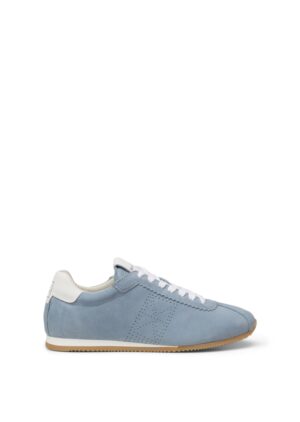 Retro-Sneaker aus softem Velours-Ziegenleder mit kontrastfarbenen Glattlederakzenten für einen dynamischen Look. Innen sorgen ein atmungsaktives Futter und eine herausnehmbare Innensohle aus recycelter Mikrofaser für hohen Tragekomfort. Die zweifarbige TR-Laufsohle bietet sicheren Grip, während flache Bio-Baumwollschnürsenkel und eine dezente Logo-Perforierung sportliche Details setzen. Ein gepolsterter Fersenrand rundet den Support ab.