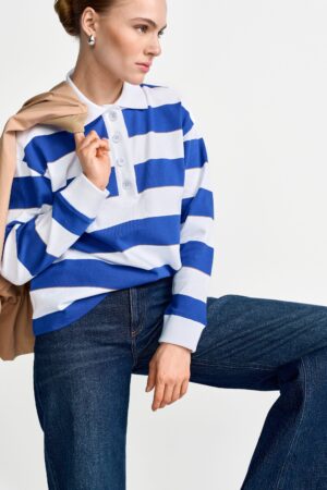 Der gestreifte Polo-Pullover von Rich & Royal vereint modernen Stil mit hochwertigen Materialien und sorgfältiger Verarbeitung. Ideal für modebewusste Frauen, die Komfort und Individualität schätzen.