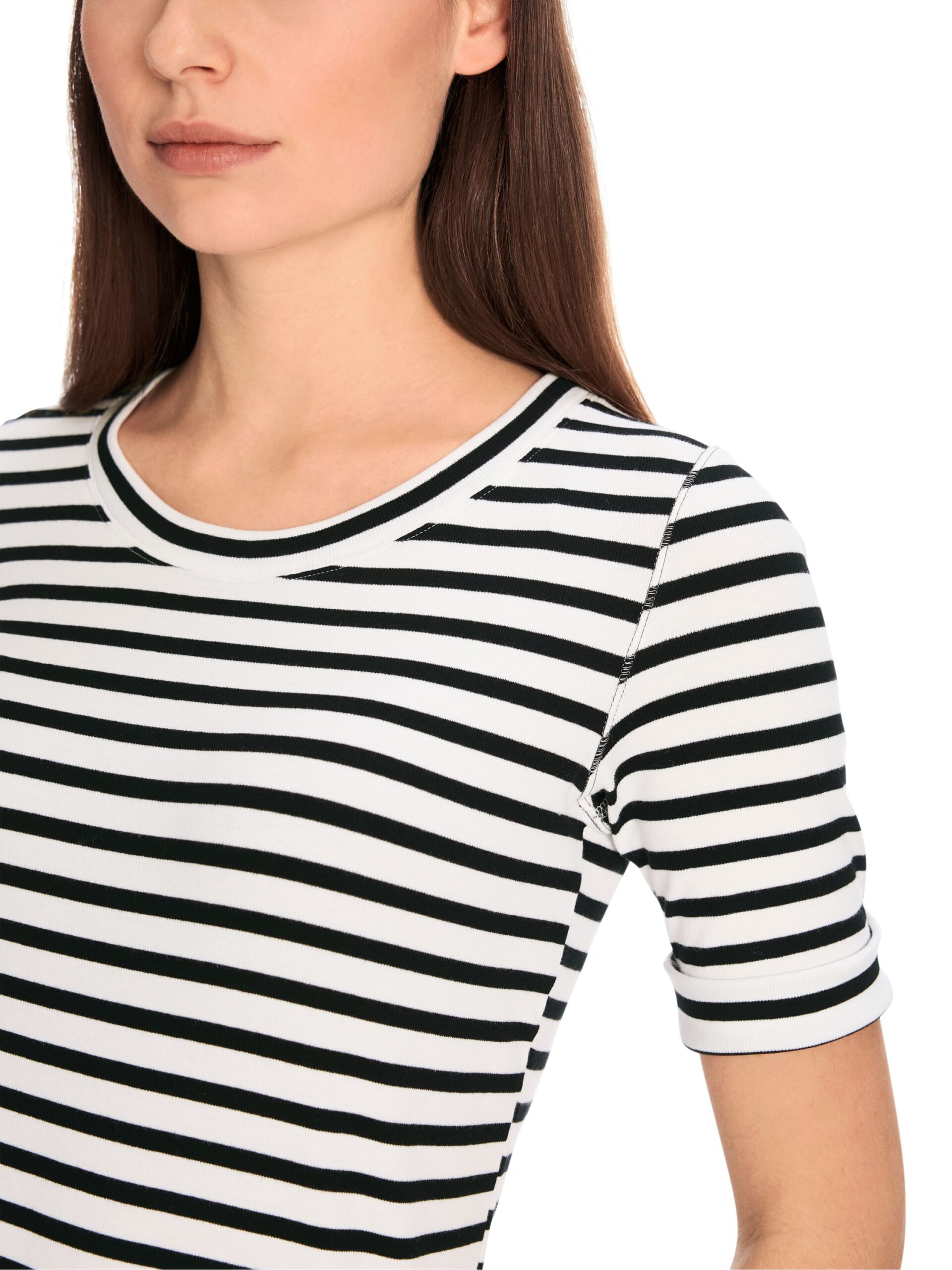 Schmal geschnittenes T-Shirt aus stretchigem Baumwoll-Ripp. Das Modell hat ein rundes Dekolletee und 3/4-Ärmel. Der Ringel ist allover. Ein toller Basic für sportive Looks. Das Model ist 179 cm groß und trägt N3/38.
