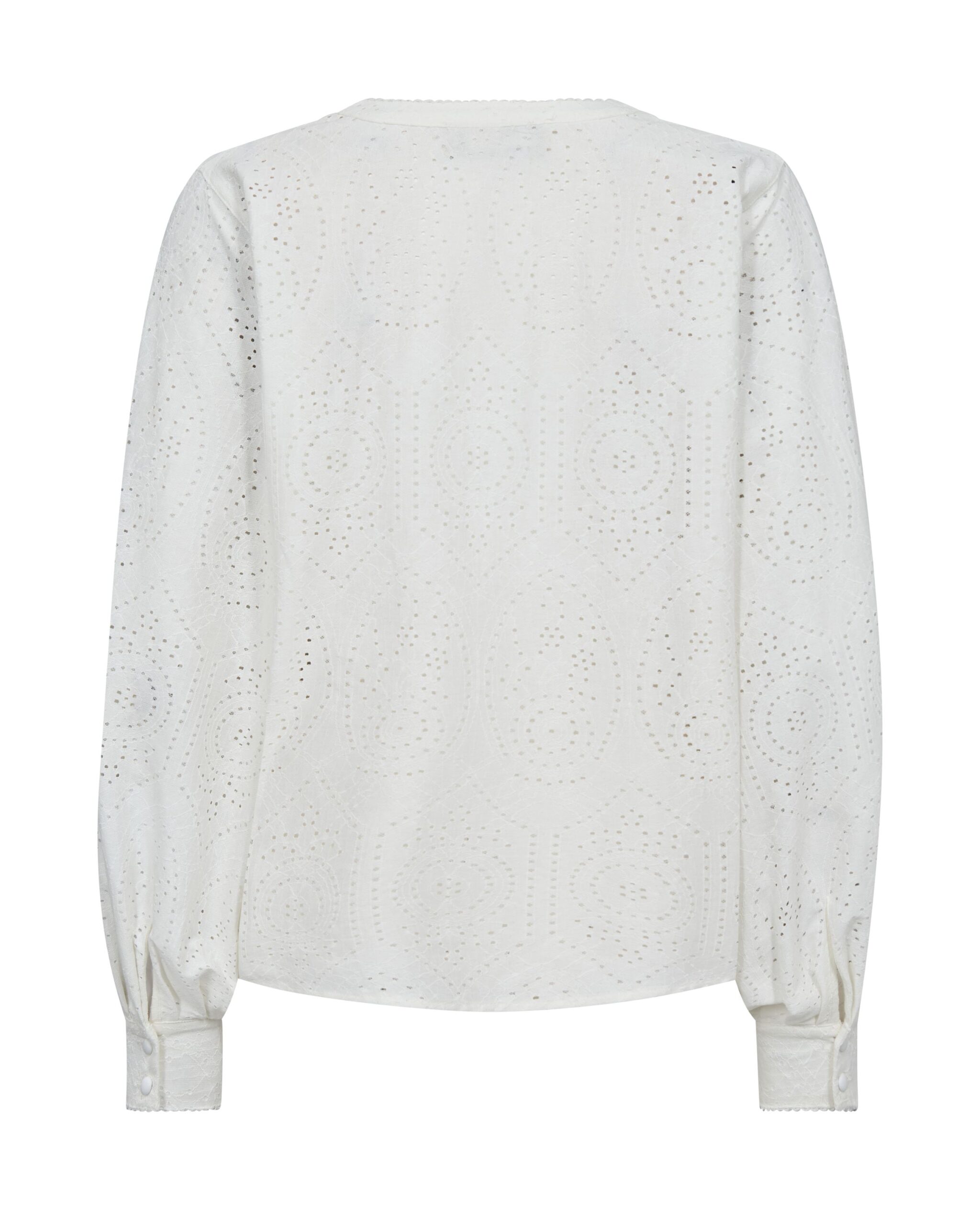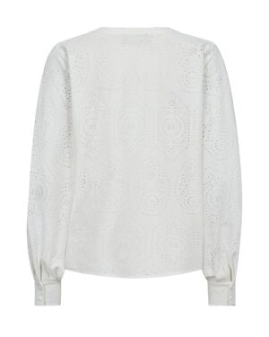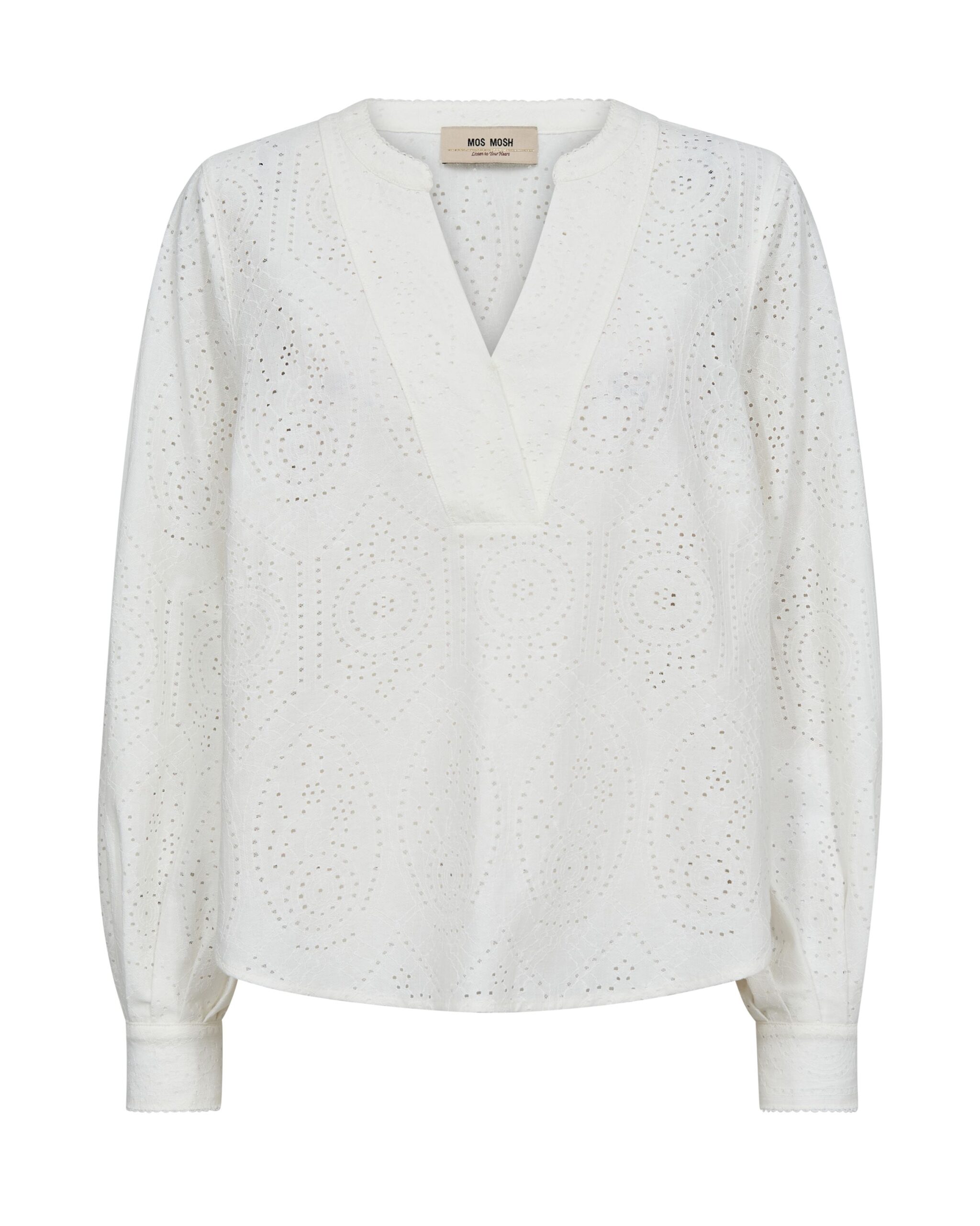 Die MOS MOSH MMYen Sina Lace Bluse Spitzenbluse steht für schmeichelhafte Eleganz. Sie hat eine leicht lockere Silhouette, einen schmeichelhaften V-Ausschnitt und ein aufwändiges grafisches Spitzenmuster mit dezentem 3D-Effekt. Die Bluse hat Ballonärmel und Wellenkanten an den Ärmeln und am Ausschnitt.
