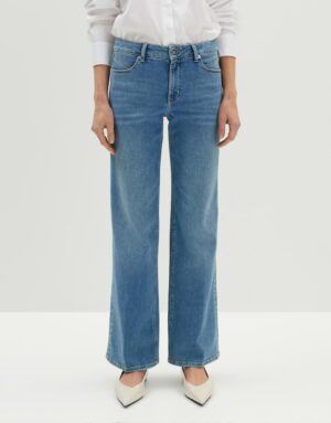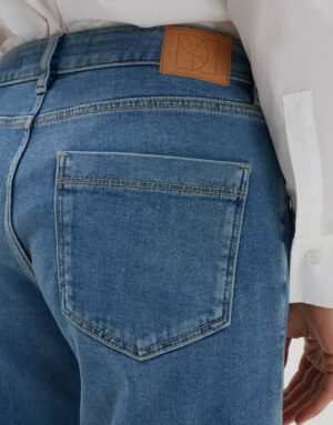 Die Carie iconic Hose aus Denim überzeugt mit einem leicht ausgestellten Bein und einer Beininnenlänge von ca. 81 cm. Das Modell in Größe 36 hat eine Körpergröße von 176 cm und trägt die Hose mit Swingpockets vorne, eckigen Gesäßtaschen, Bügelfalten und verdecktem Zip-Fly.