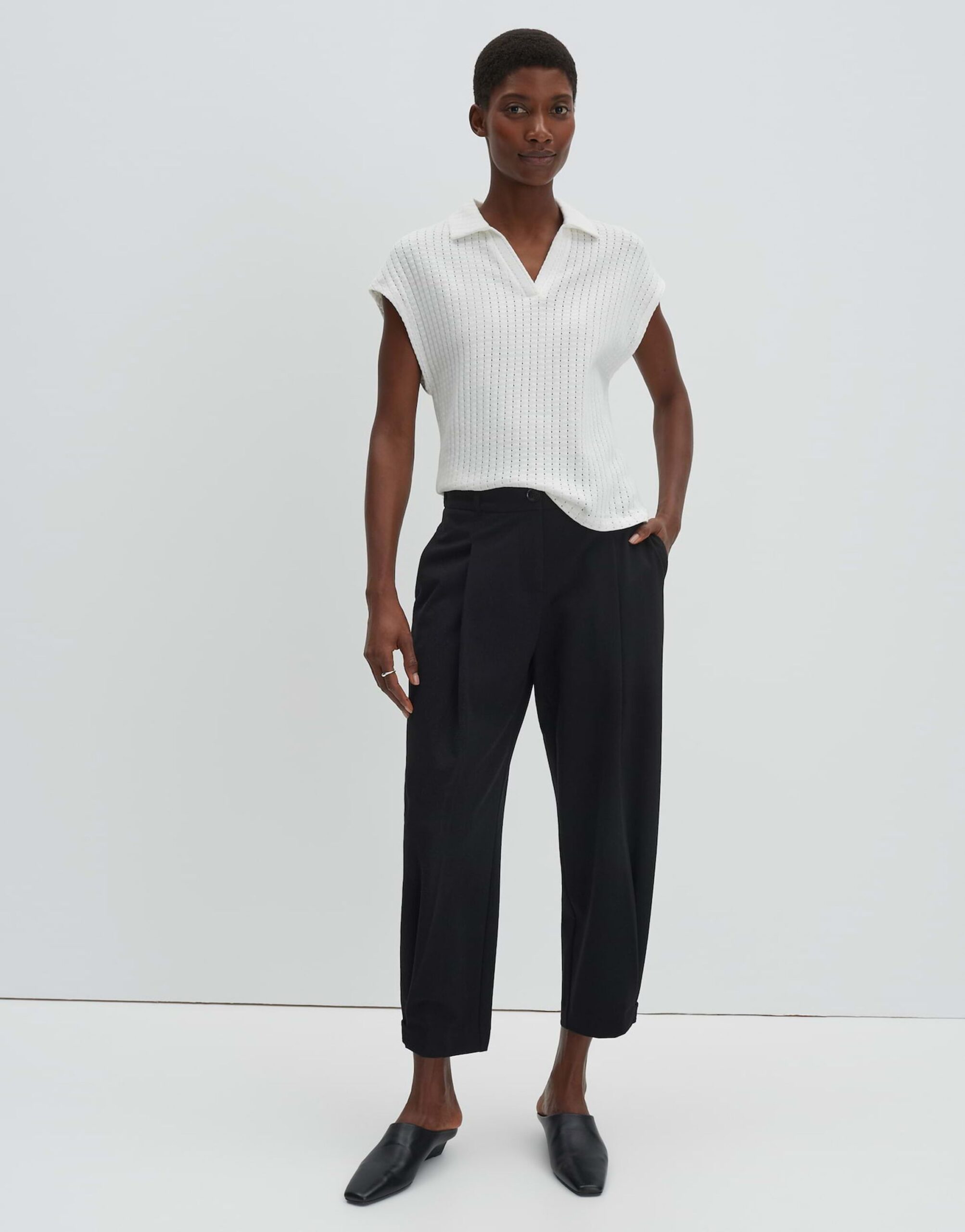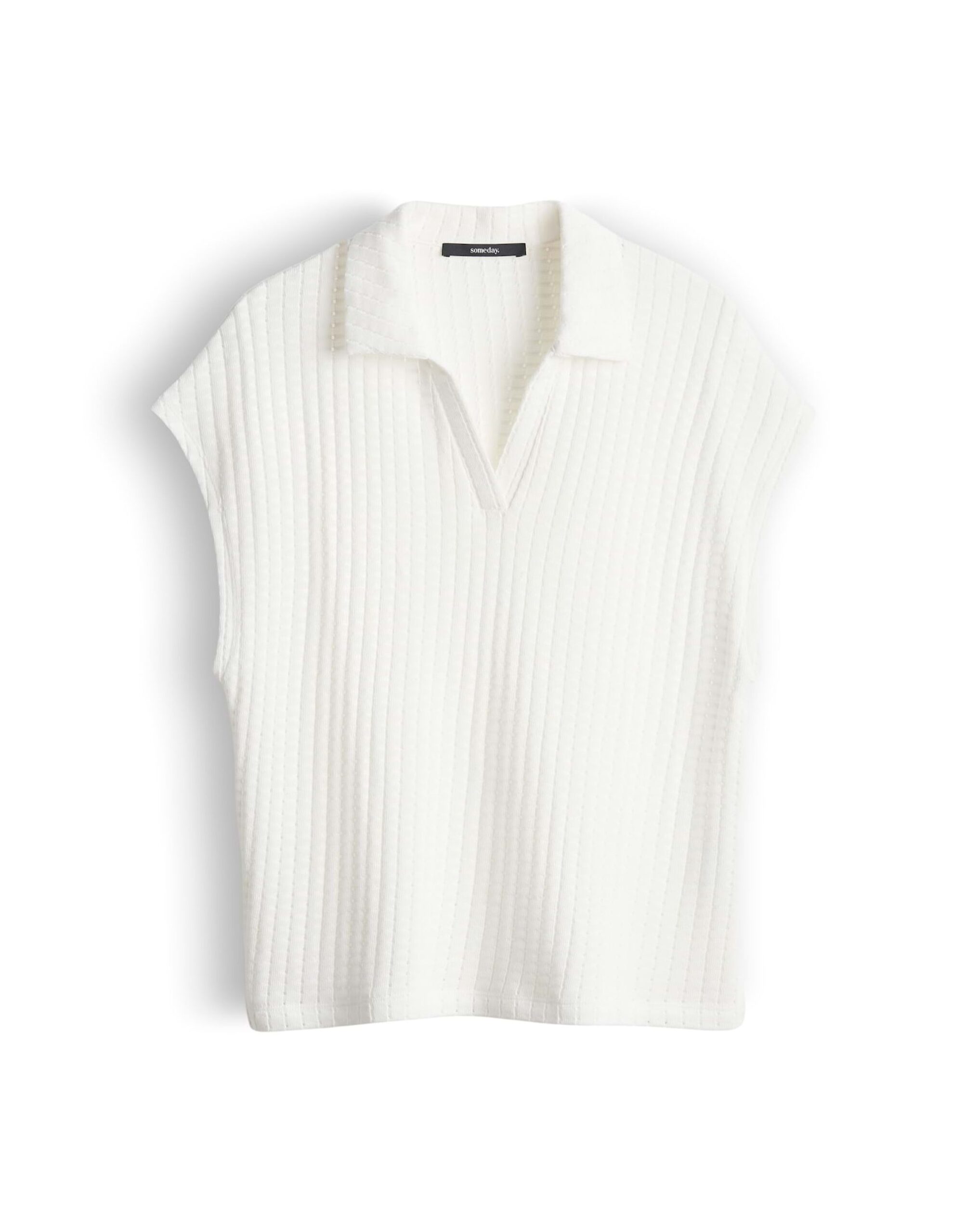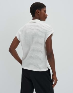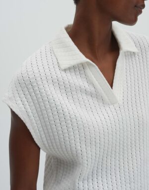 Das Kimena Kleid in lockerer Passform und mit überschnittenen Kurzarmen besticht durch seinen V-Ausschnitt, Polokragen und das dezente Lochmuster. Die Rückenlänge beträgt ca. 58 cm bei Größe 36. Der elastische Stoff mit weichem Griff und kleinen Schlitzen an den Seiten sorgt für hohen Tragekomfort. Perfekt für einen lässigen Look.