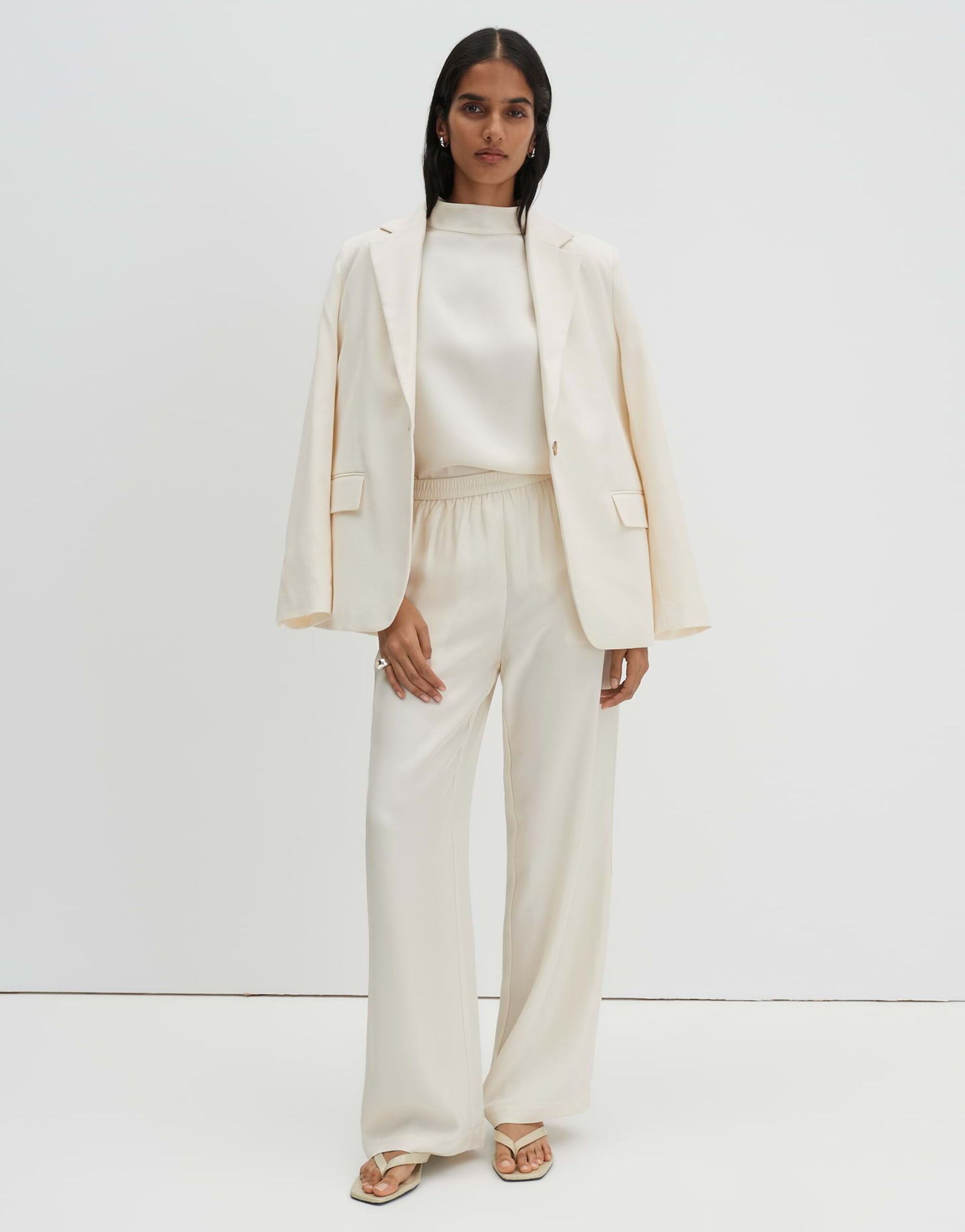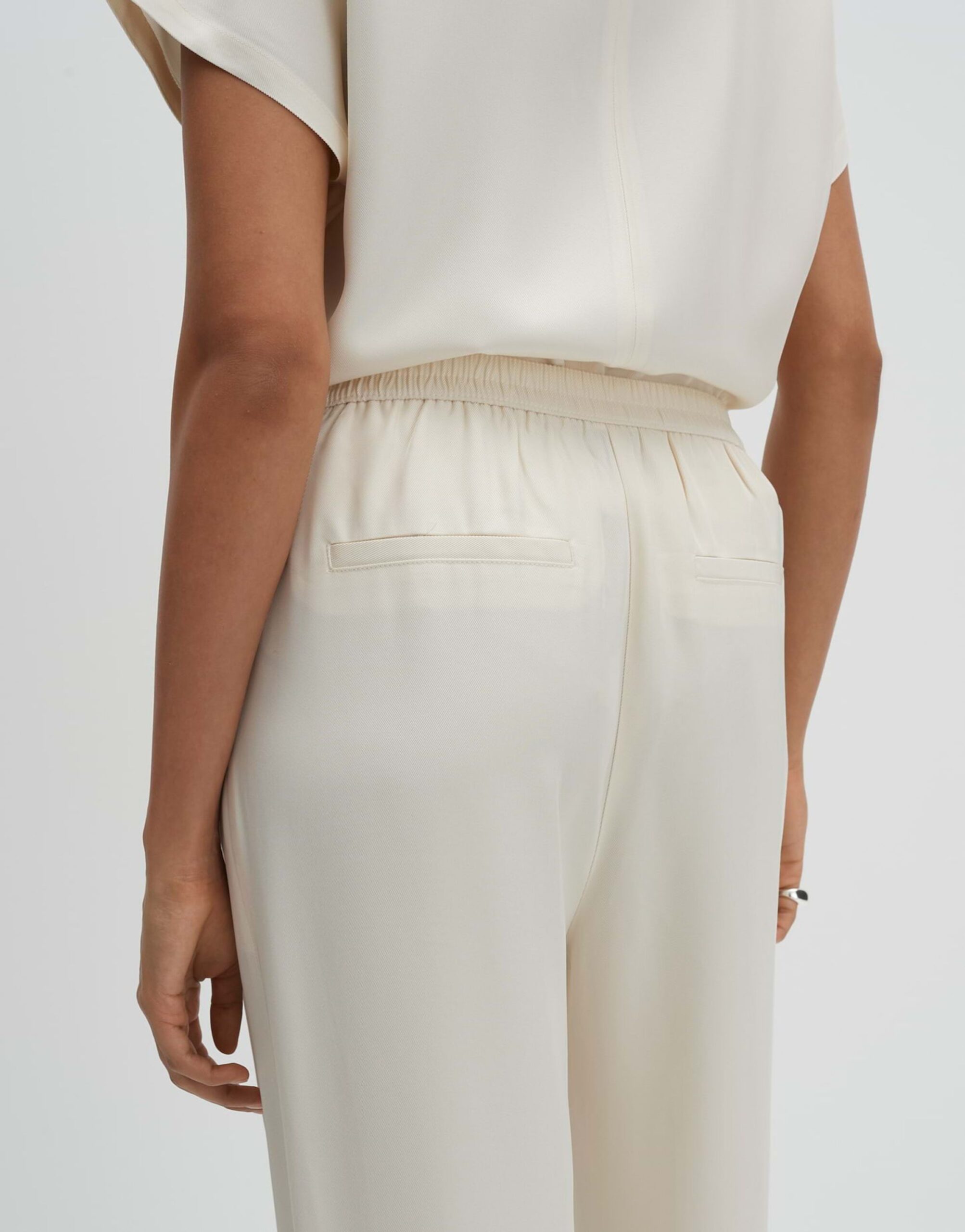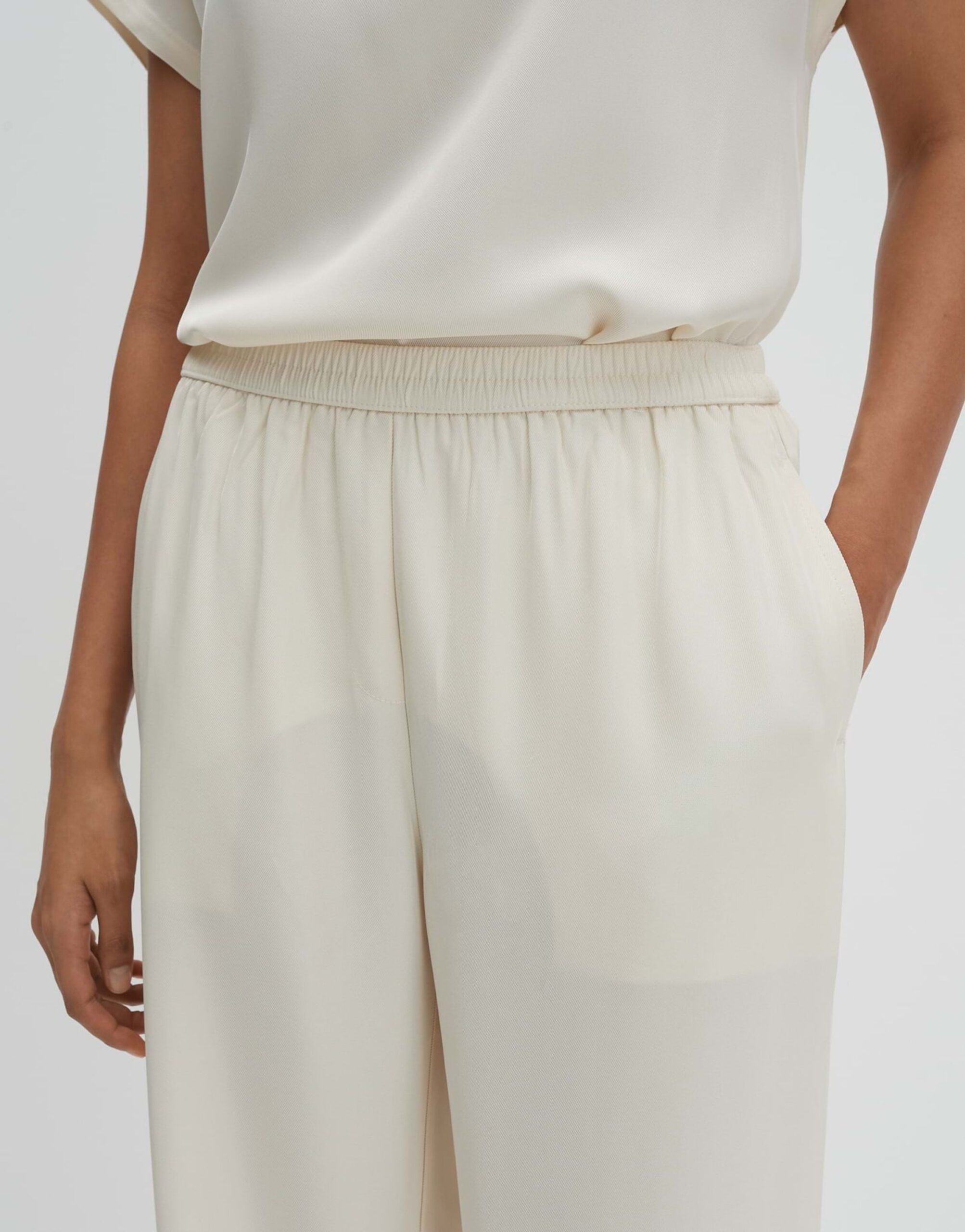 Die Hose „Cevil flow“ von SOMEDAY besticht durch ihren weiteren, geraden Beinverlauf und den elastischen Gummibund. Das Hosenbein hat eine Innenlänge von ca. 78 cm in jeder Größe. Das Modell ist 173 cm groß und trägt Größe 36. Die Hose ist aus glattem Satin gefertigt und verfügt über eine dezente Twillstruktur. Sie ist knitterarm, hat eine schimmernde Oberfläche und eine leichte Transparenz in hellen Farben. Ausgestattet ist die Hose mit Nahttaschen in der Seitennaht, Zier-Paspeltaschen hinten, Bügelfalten und einem angedeuteten Hosenschlitz.