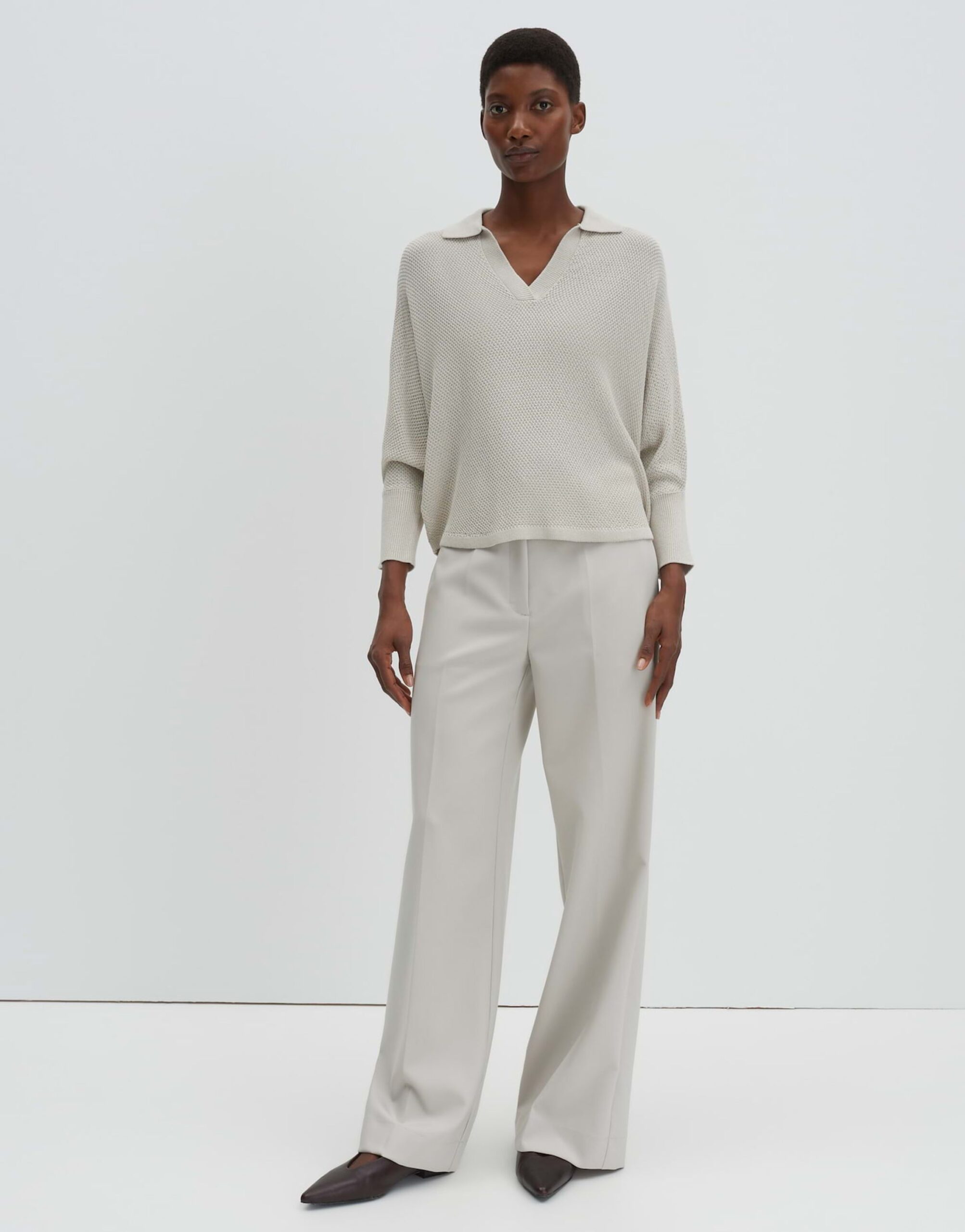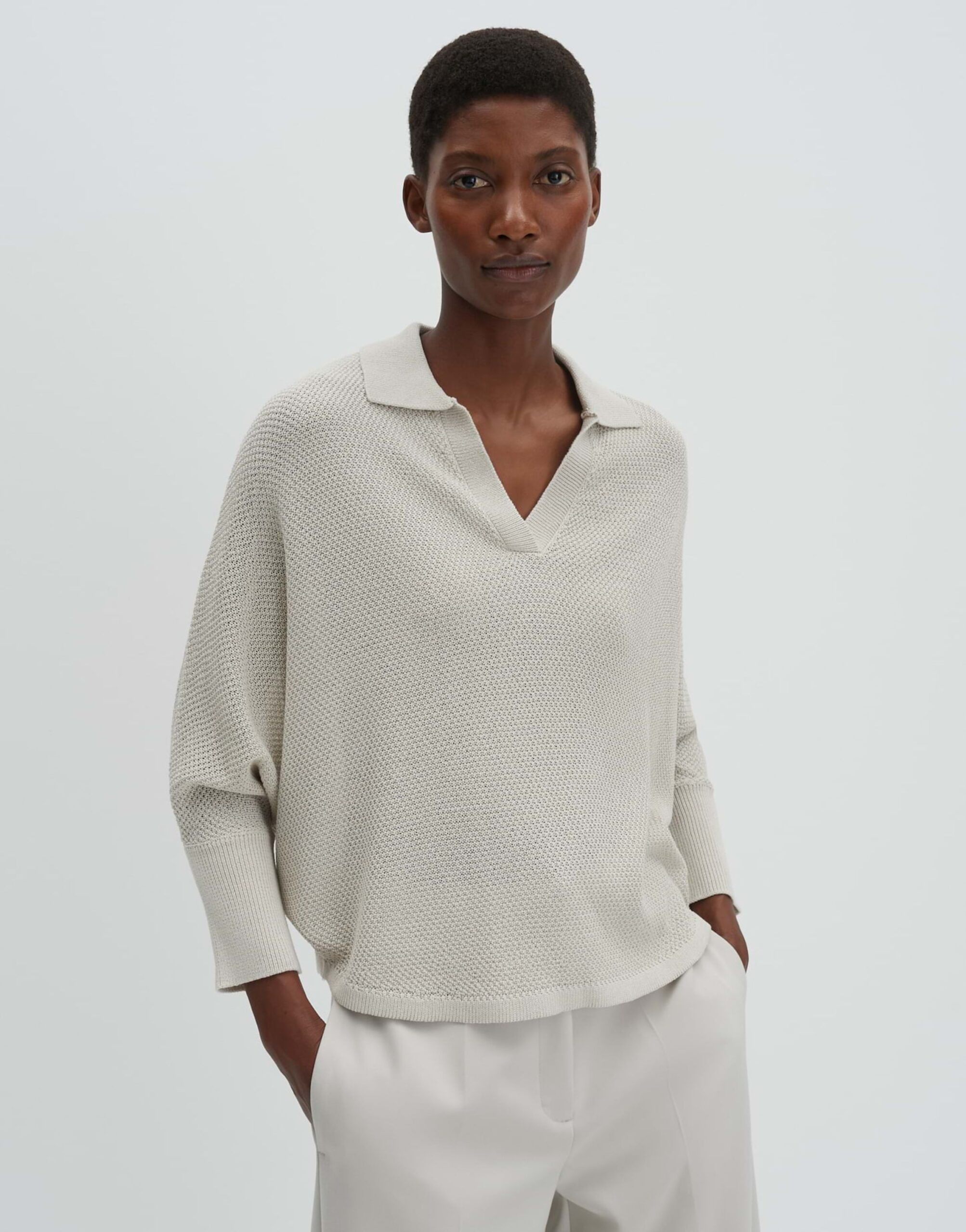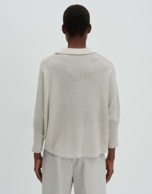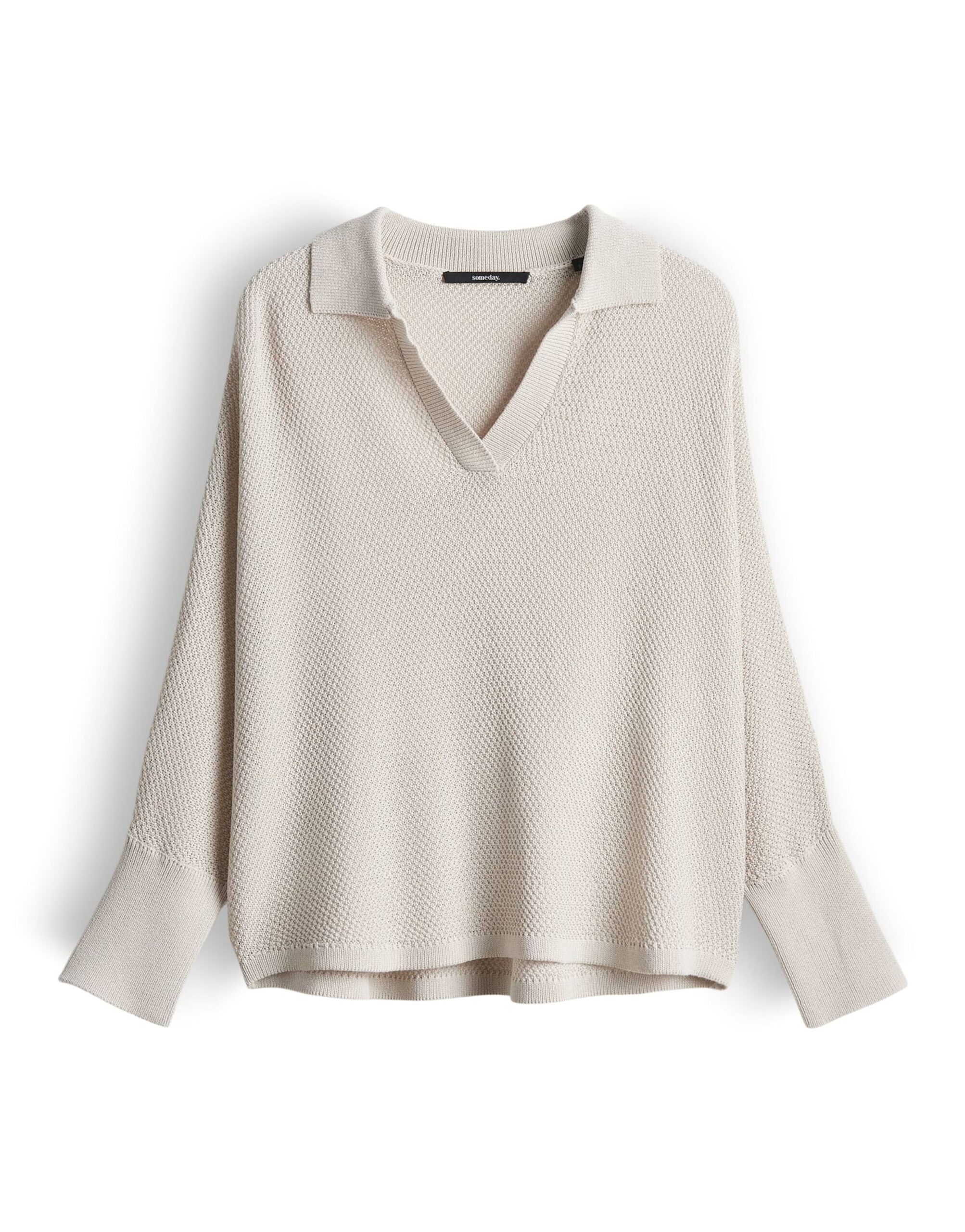 Der Strickpullover Telanora von SOMEDAY überzeugt mit seiner weiten Passform und dem oversized Design. Er ist leicht verkürzt geschnitten und verfügt über einen V-Ausschnitt sowie überschnittene 3/4 Ärmel. Der Polokragen und die leichte Transparenz verleihen dem Pullover eine besondere Note. Das Modell ist 176 cm groß und trägt Größe S. Der Strickpullover hat einen natürlichen Griff, einen fließenden Fall, Strickbündchen und einen abgerundeten Saum.