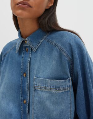 Die Denim-Bluse von Zebru besticht durch ihre weite Passform und Boxy Silhouette. Mit einer verkürzten Länge und Raglanärmeln ist sie ein lässiger Begleiter für den Alltag. Die Bluse verfügt über einen Hemdblusenkragen, eine große Brusttasche und Knöpfe in Horn Optik. Die leichte Used-Effekte verleihen ihr einen coolen Look.