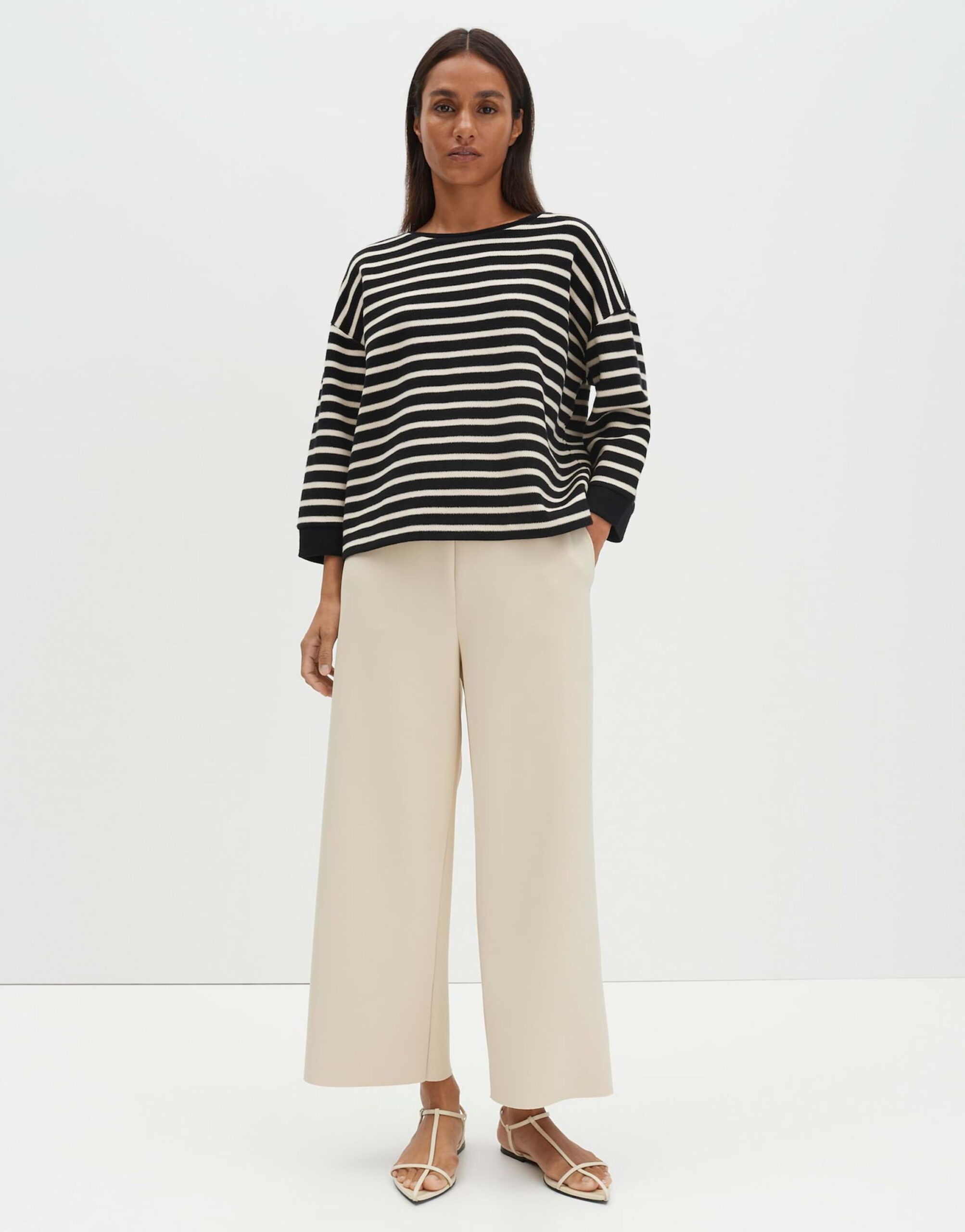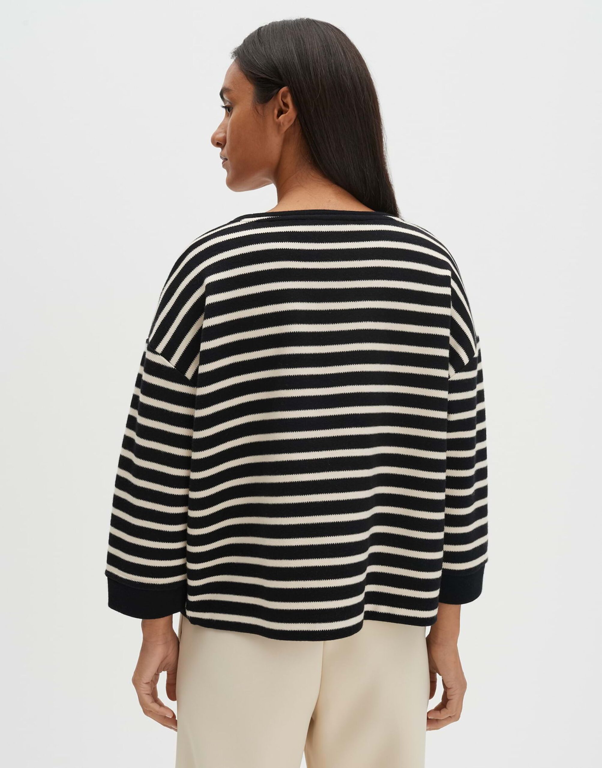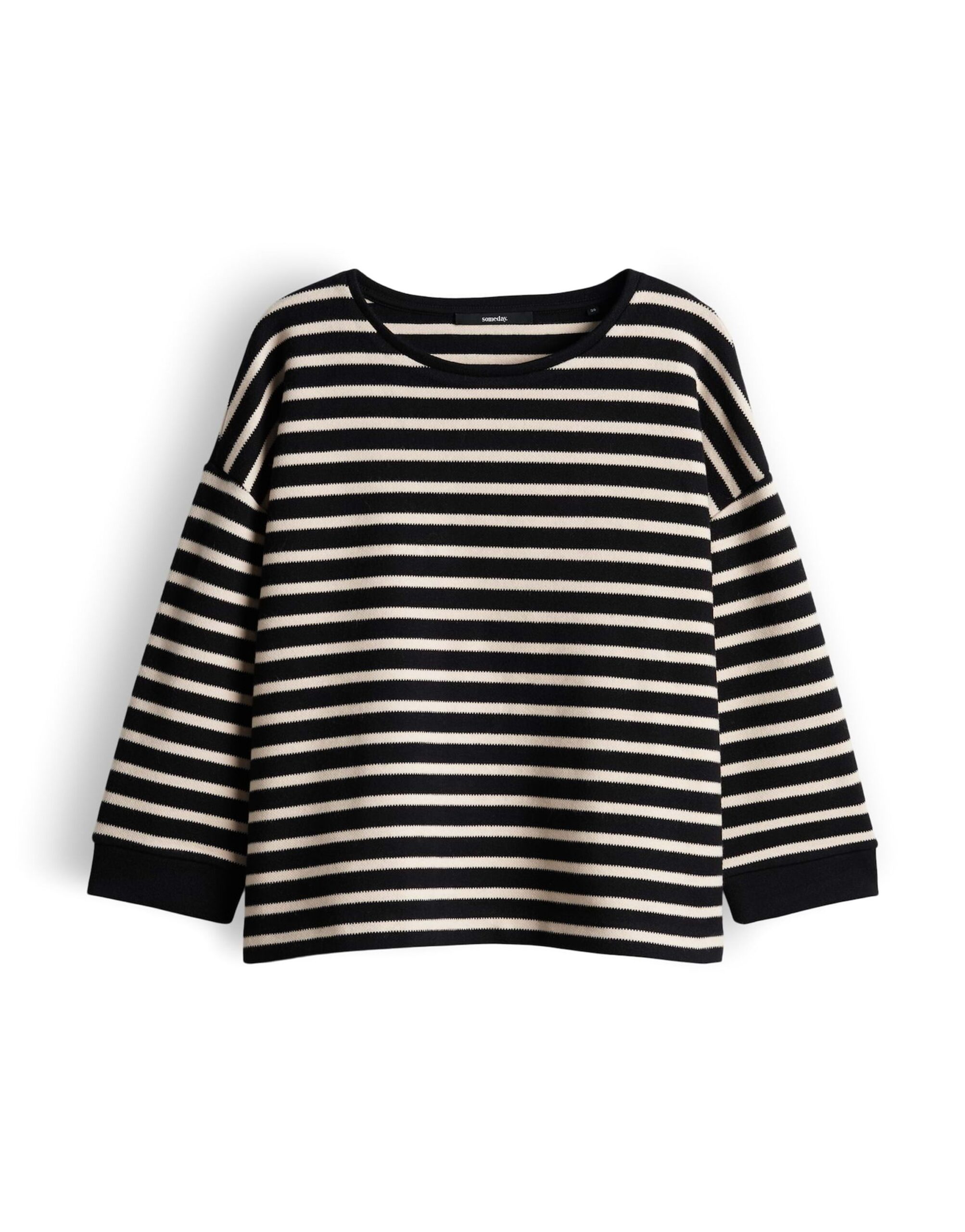 Das Uleno Sweatshirt von SOMEDAY besticht durch seine weite Passform und den geraden Schnitt. Es ist leicht verkürzt geschnitten und verfügt über überschnittene Schultern mit 3/4 Ärmeln. Der Rundhalsausschnitt und der elastische Rippbund sorgen für einen bequemen Sitz. Das Sweatshirt in Strickoptik mit Streifenmuster ist aus einer weichen Sweatware gefertigt.