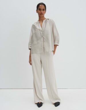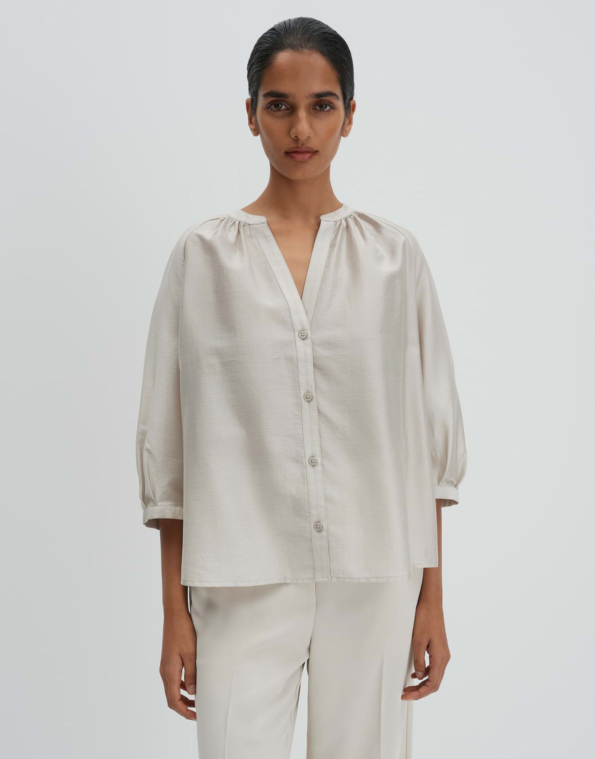 Die lockere Bluse Zamida von SOMEDAY ist leicht ausgestellt geschnitten und verfügt über einen 3/4 Arm. Sie hat einen Rundhals mit V-Ausschnitt, eine Rückenlänge von ca. 62 cm und dezente Details wie Kräuselung am Ausschnitt und Faltendetail am Ärmelsaum. Der leichte Stoff mit dezenter Struktur und glatter Oberfläche verleiht der Bluse einen dezenten Schimmer und eine leichte Transparenz.