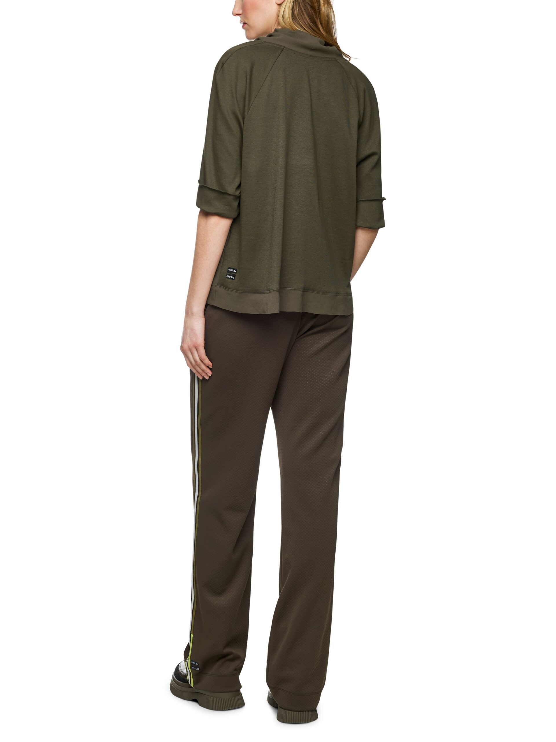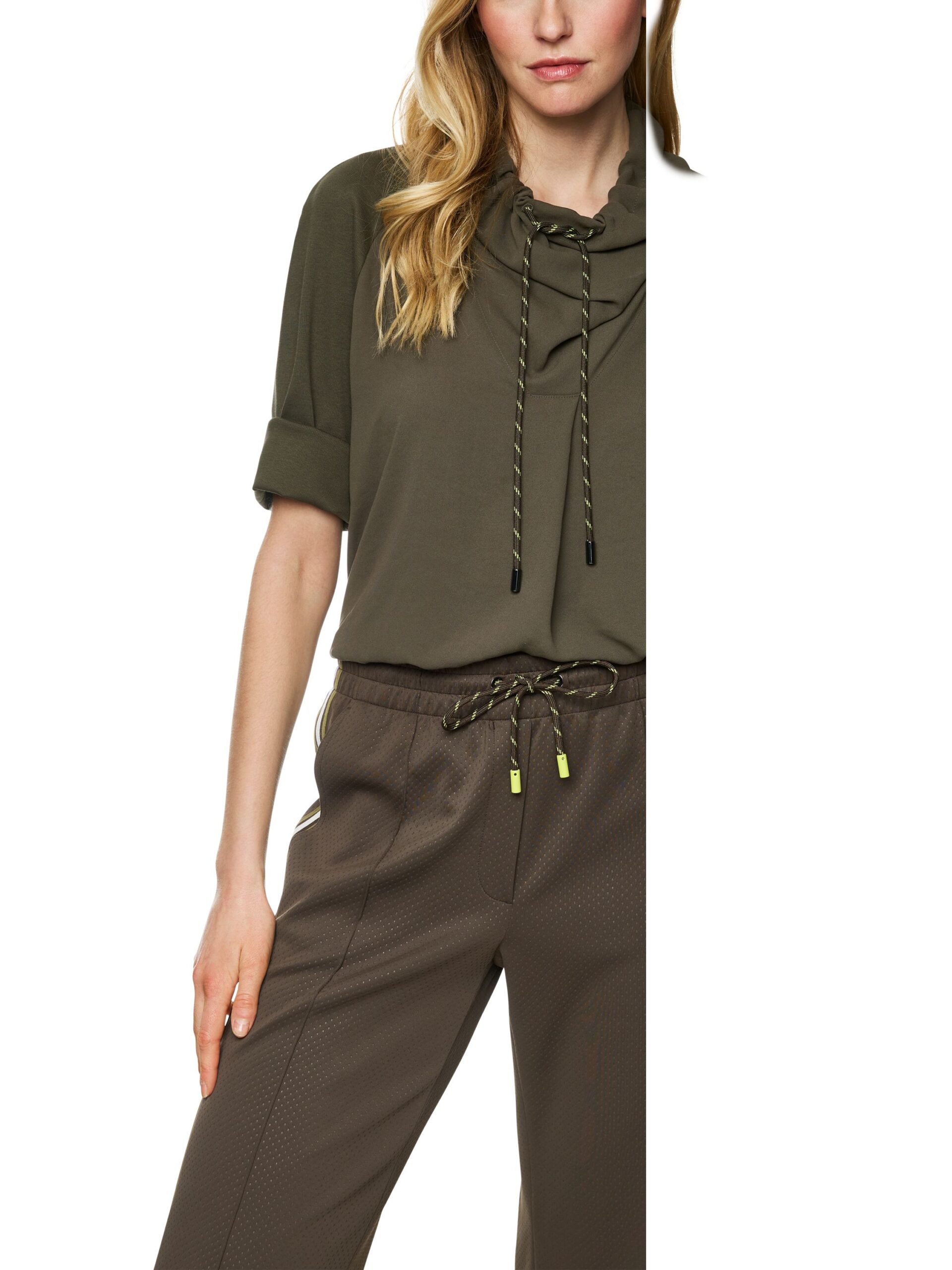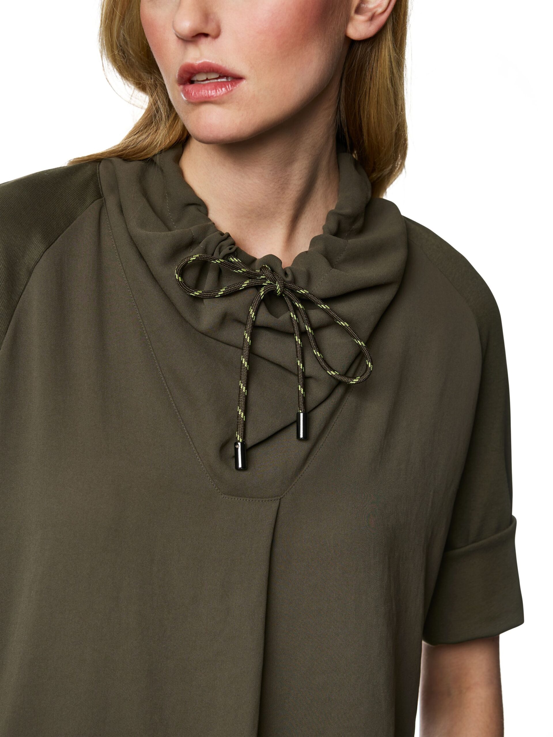 Das fließende Blusenshirt ist vorne aus leichter Kunstfaser gefertigt, während das Rückenteil und die Ärmel aus Baumwollstretch in Ripp-Design hergestellt wurden. Den sportiven Look unterstreicht der kleine Wasserfallkragen mit mehrfarbiger Kordel. Der Sports-Cube am Saum und wellige Ärmelabschlüsse runden das Design ab. Weit geschnitten. Kragen mit Kordel. Dreiviertellange Ärmel. Das Model ist 179 cm groß und trägt N3/38.