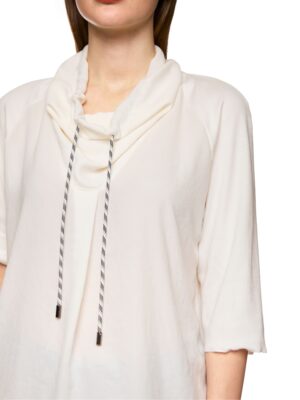 Das fließende Blusenshirt ist vorne aus leichter Kunstfaser gefertigt, während das Rückenteil und die Ärmel aus Baumwollstretch in Ripp-Design hergestellt wurden. Den sportiven Look unterstreicht der kleine Wasserfallkragen mit mehrfarbiger Kordel. Der Sports-Cube am Saum und wellige Ärmelabschlüsse runden das Design ab. Das Shirt ist weit geschnitten, hat einen Kragen mit Kordel, dreiviertellange Ärmel und wird von einem Model in Größe N3/38 präsentiert.