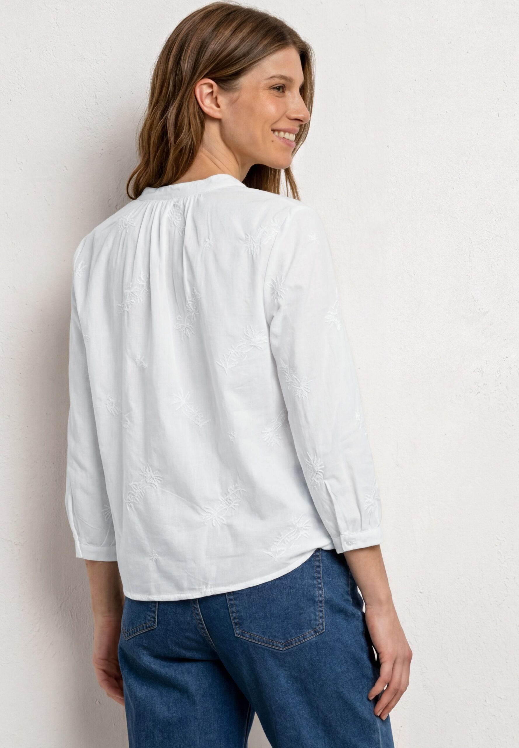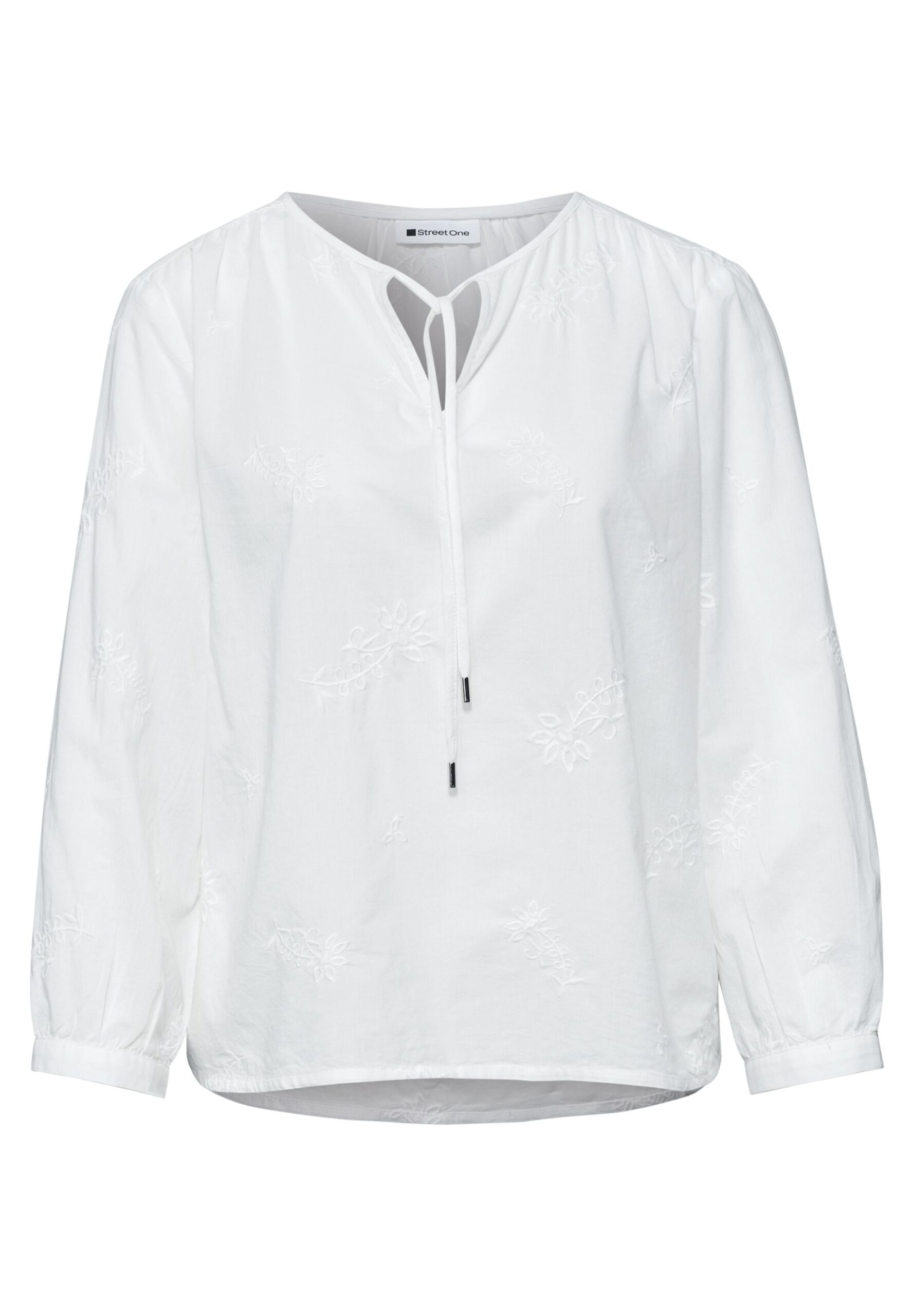 Die 3/4-Arm Bluse mit Embroidery von Street One begeistert mit einer femininen Allover-Stickerei und natürlichem Tragekomfort. Die reine Baumwolle liegt angenehm auf der Haut und sorgt für ein luftiges Gefühl. Der Split Neck mit Bändern und der 3/4-Arm mit schmalem Bündchen und Knopf unterstreichen den entspannten Casual-Stil. Der leicht gerundete Saum macht die unifarbene Bluse vielseitig kombinierbar.